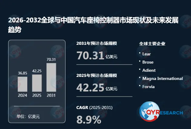 根据QYR(恒州博智)的统计及预测,2025年全球汽车座椅控制器市场销售额达到了42.25亿美元,预计2031年将达到70.31亿美元,年复合增长率(CAGR)为8.9%(2025-2031)。