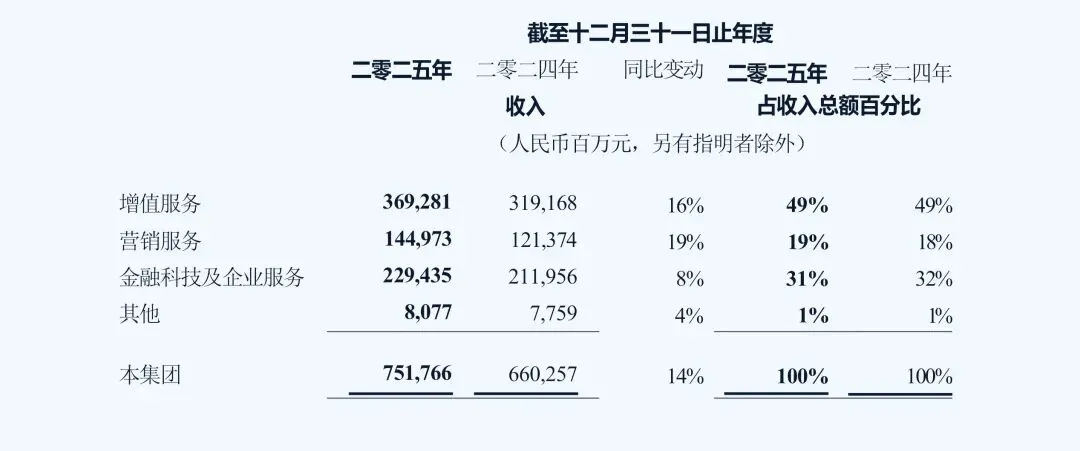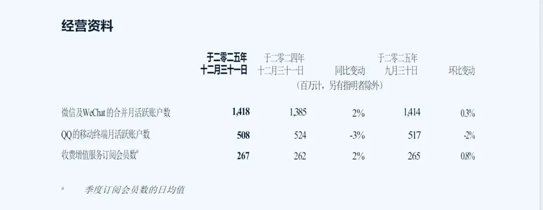 2025年微信及WeChat的合并月活跃账户数为14.18亿,同比增长2%;QQ移动端活跃账户数为5.08亿,同比下降3%;增值服务付费会员数2.67亿,同比增长2%。
