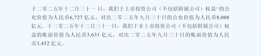 于2025年底,投资业务价值10358亿元。其中,于上市公司(不包括附属公司)权益的公允价值为人民币6727 亿元,于非上市公司(不包括附属公司)权益的账面价值为人民币3631 亿元。