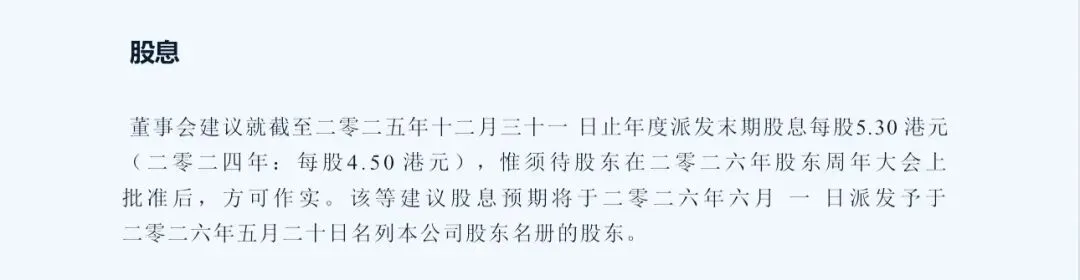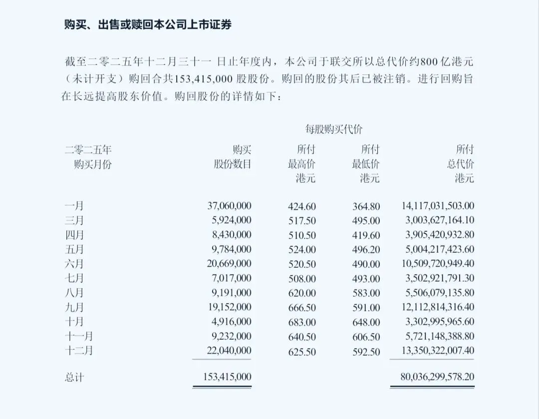 2025年股份回购800亿港元,年末派息每股5.3港元合计483亿元,合计1283亿。