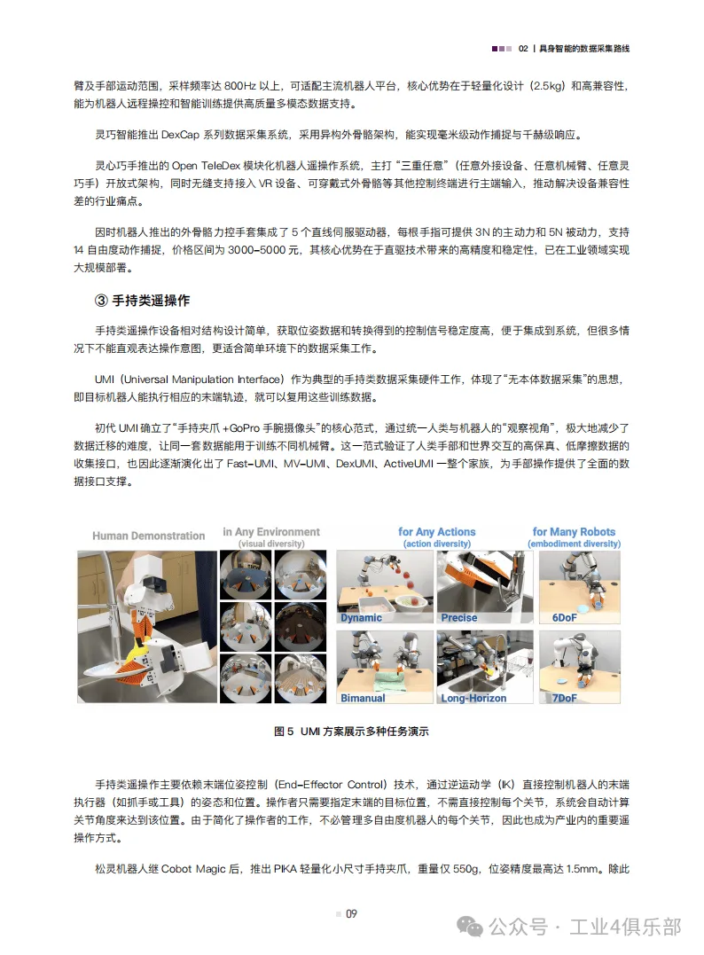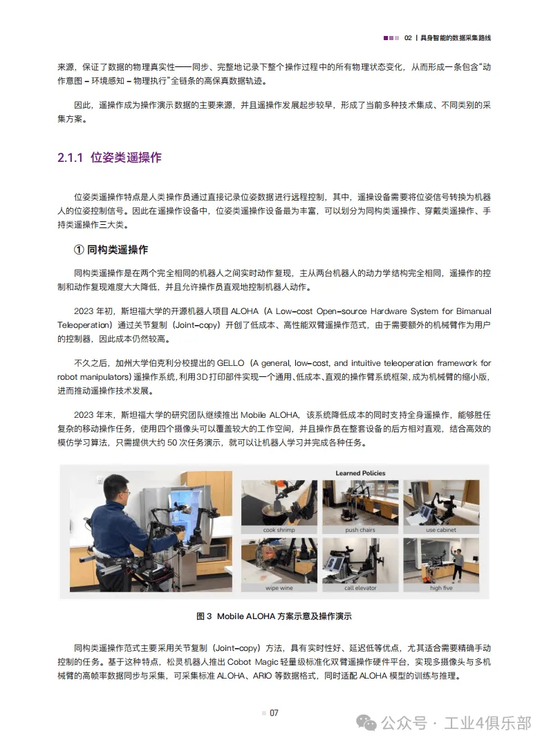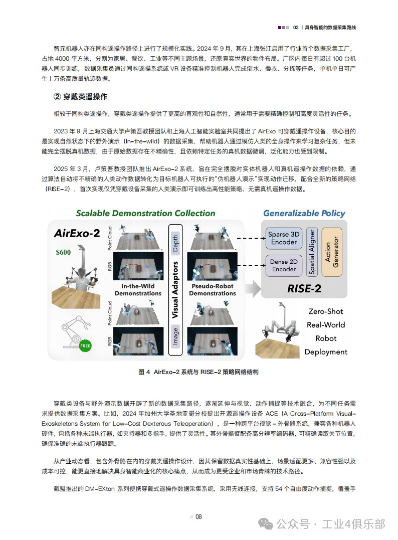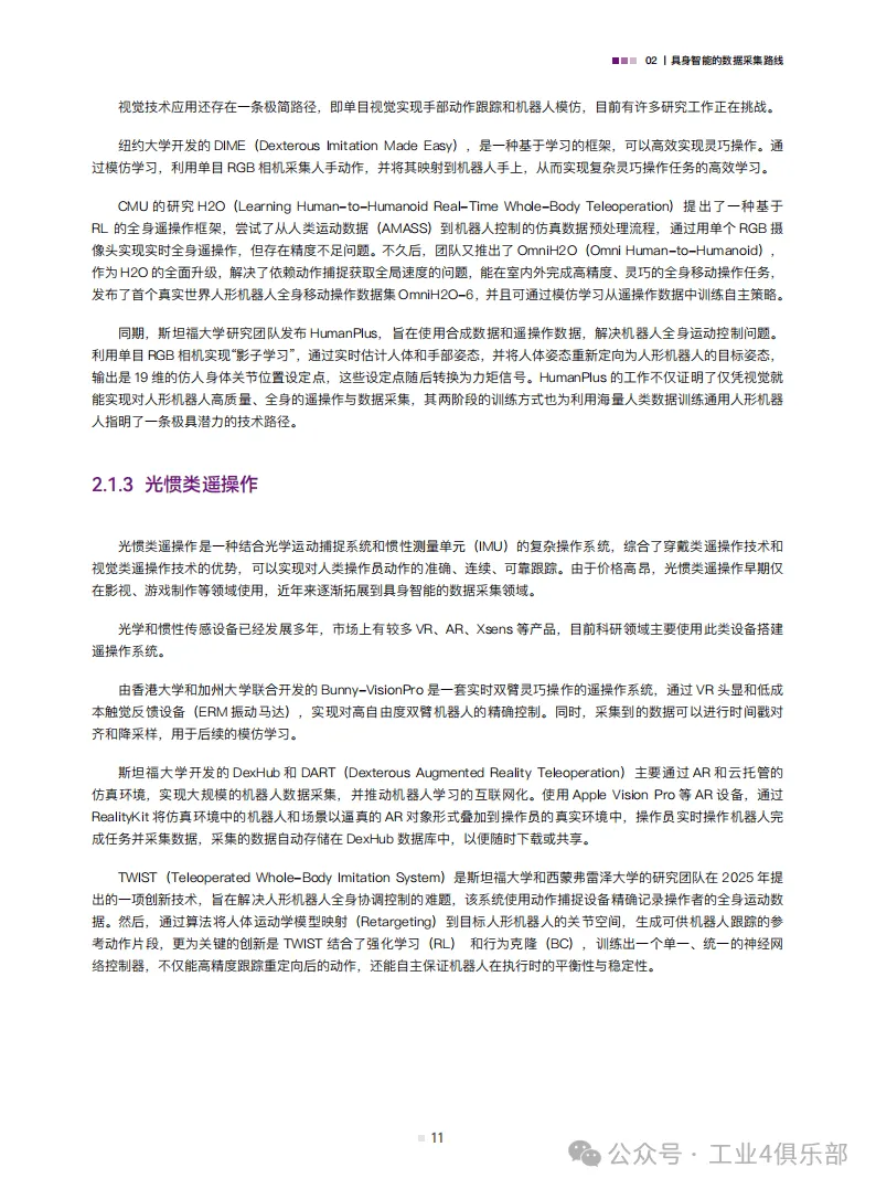 白皮书归纳了遥操作、动作捕捉、互联网视频与合成数据三类核心数据采集路线,各有优劣且呈现融合趋势。遥操作数据精度高,是当前主流,分为位姿、视觉、光惯类等;动作捕捉数据是连接真实与虚拟的桥梁,能补充操作和运动控制数据需求;互联网视频数据规模大但精度低,合成数据则通过仿真与算法生成,可弥补真实数据不足,二者均是未来重要的数据来源。