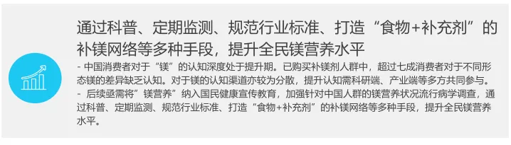 镁营养不足已成为影响中国国民健康的重要问题,提升全民镁营养水平,需要科研端、产业端、政府端、公众端多方协同发力,从科普、监测、标准、落地等多方面入手,打造全民补镁的健康网络。