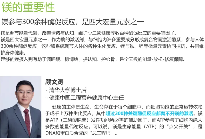 镁是人体四大宏量元素之一,是调节能量代谢、改善情绪认知、维护心血管健康的核心辅因子,更是细胞能量ATP的“点火开关”,但中国国民的镁营养状况却不容乐观。
