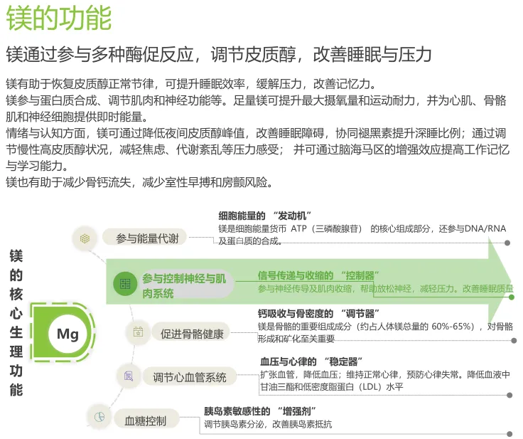 该年龄段是事业攀升和成家生育的关键期,双重压力导致皮质醇升高,镁对男性能调节压力、维护骨密度,对经期女性能缓解经前综合征和痛经,对孕期女性能促进胎儿矿化、降低子痫前期风险,对哺乳女性能改善产后情绪、减少骨量丢失。这一人群补镁的核心需求是日常维护、预防慢病,女性更关注情绪改善,孕期和哺乳期女性则侧重提升精力、缓解焦虑。