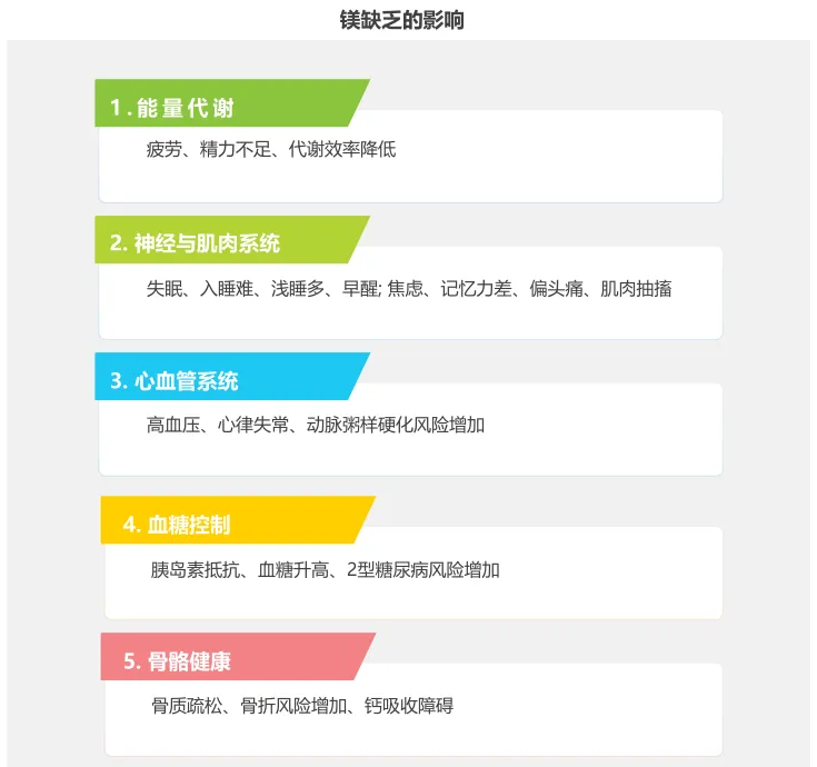 缺镁的危害遍布全身:短期缺镁会引发疲劳乏力、失眠焦虑、肌肉抽搐、偏头痛等问题;长期缺镁则会提升慢病风险,增加高血压、心律失常、胰岛素抵抗、骨质疏松等疾病的发生概率,甚至与焦虑抑郁症状呈显著正相关。