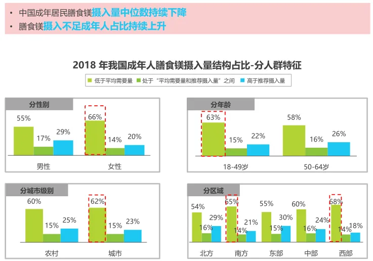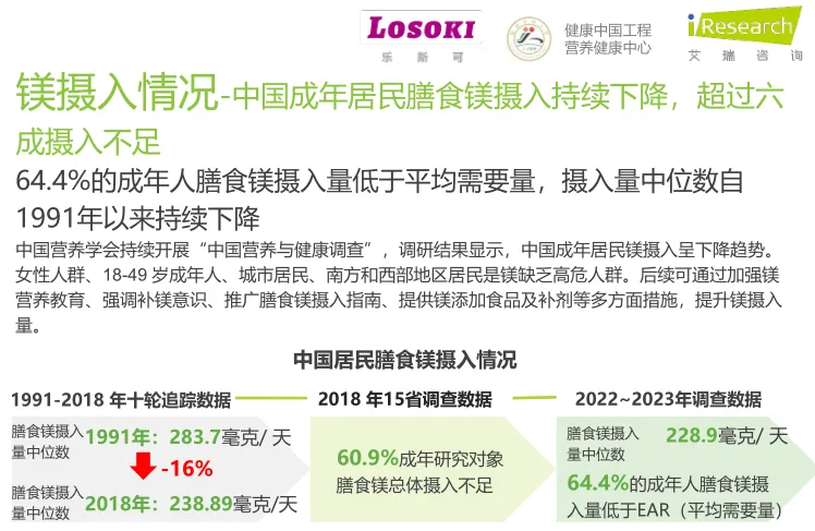 摄入不足成常态:中国成年居民膳食镁摄入量呈持续下降趋势,1991年至2018年摄入量中位数下降16%,目前64.4%的成年人膳食镁摄入量低于平均需要量,女性、18-49岁人群、城市居民、南方和西部地区居民是镁缺乏高危人群。