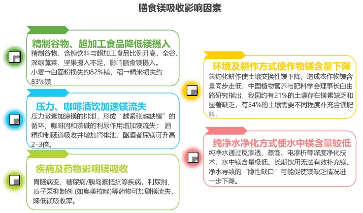 四大原因导致镁流失与缺乏:饮食结构西化精细化,精制米面、加工食品占比升高,小麦制白面粉损失约82%镁,稻米制精米损失约83%镁;现代农业过度使用化肥导致土壤贫瘠化,我国21%的土壤镁素缺乏,54%的土壤需补充镁肥;慢性压力、熬夜、过量饮酒、长期喝纯净水等生活方式,加速镁的排泄与消耗;镁的科普力度不足,国民对镁的认知和重视程度远远不够。