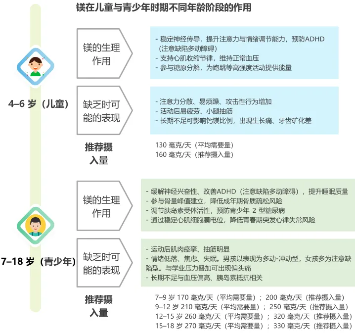 4-6岁儿童的镁是“生长燃料”,核心作用是促进骨骼发育、提升专注力和免疫力,缺镁易出现注意力分散、生长痛、小腿抽筋;7-18岁青少年正值骨量峰值建立关键期,镁能改善睡眠、调节情绪,预防青春期心律失常和青少年2型糖尿病,缺镁则会导致运动后抽筋、焦虑失眠、偏头痛。家长对孩子补镁的核心需求集中在提升免疫力、帮助骨骼生长,同时希望补镁剂能兼顾服用便捷性,避免孩子抗拒。
