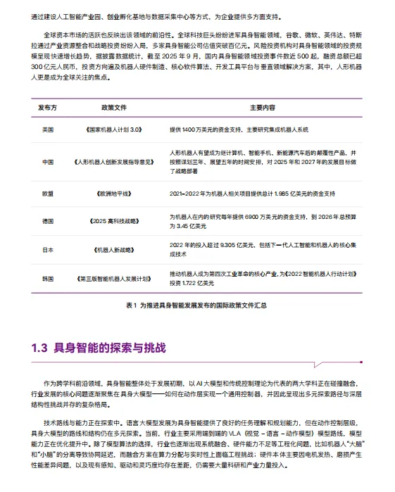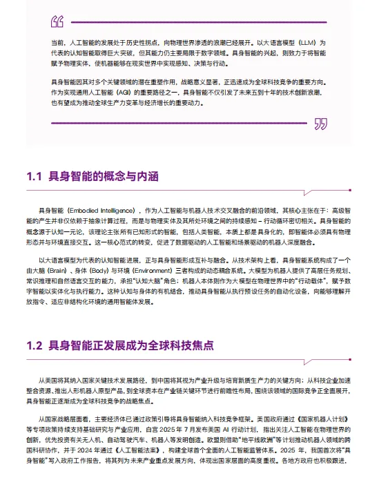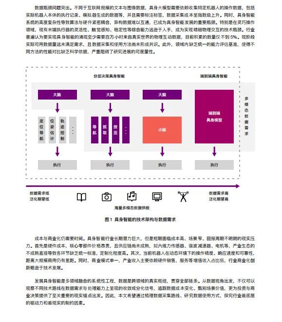 报告指出,具身智能是人工智能与机器人技术融合的前沿,旨在将智能赋予物理实体,正成为全球科技竞争的战略焦点。然而,行业在探索中面临三大深层挑战:技术路线仍在多元探索,特别是“大脑”(认知规划)与“小脑”(动作控制)的融合存在工程难题;数据瓶颈极为突出,真实世界的物理交互数据严重稀缺,且采集成本高昂、缺乏统一标准;成本与商业化路径尚不明朗,硬件成本高,场景应用有限。