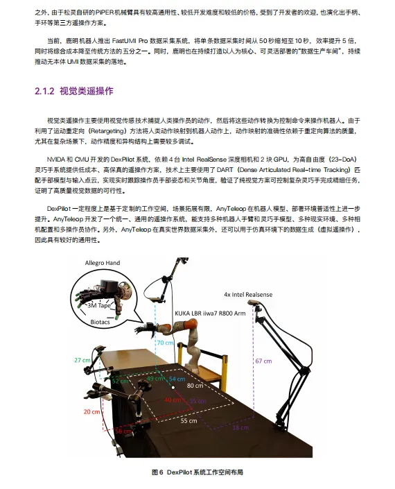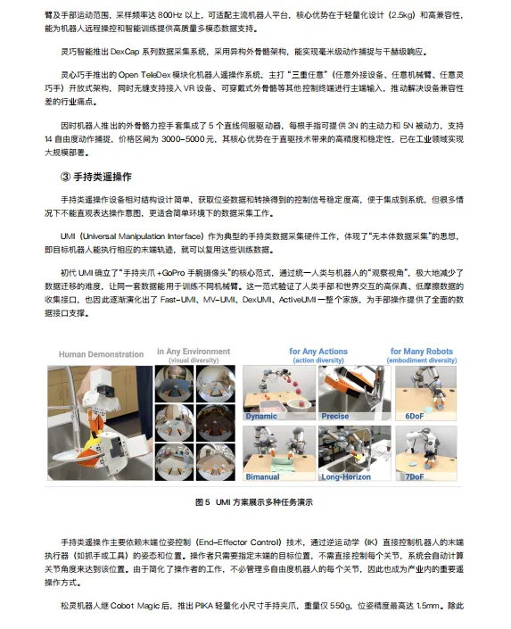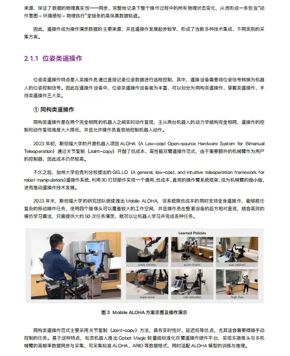 遥操作数据:当前主流,通过人类远程精确控制机器人来采集高保真、因果明确的物理交互轨迹,是数据质量的“黄金标准”。其下又细分为同构类(如Mobile ALOHA)、穿戴类(如AirExo-2、DexCap)和手持类(如UMI)等多种技术方案。