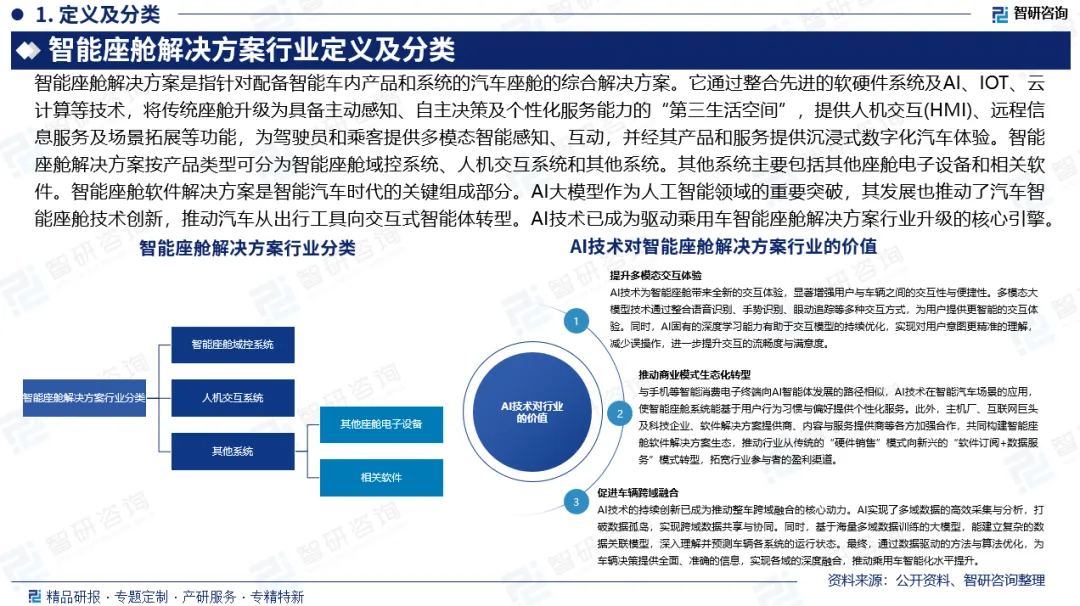 行业定义及分类:智能座舱解决方案是指针对配备智能车内产品和系统的汽车座舱的综合解决方案。按产品类型可分为智能座舱域控系统、人机交互系统和其他系统。其他系统主要包括其他座舱电子设备和相关软件。