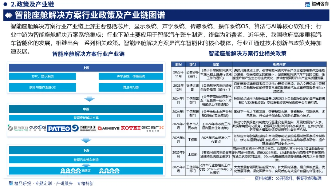 行业政策:近年来,我国政府高度重视汽车智能化的发展,相继出台一系列相关政策。如《智能网联汽车组合驾驶辅助系统安全要求》《关于开展智能网联汽车准入和上路通行试点工作的通知》《自动驾驶汽车运输安全服务指南(试行)》《关于开展智能网联汽车“车路云一体化”应用试点工作的通知》等。智能座舱解决方案是汽车智能化的核心载体,行业正通过技术创新与政策支持加速发展。