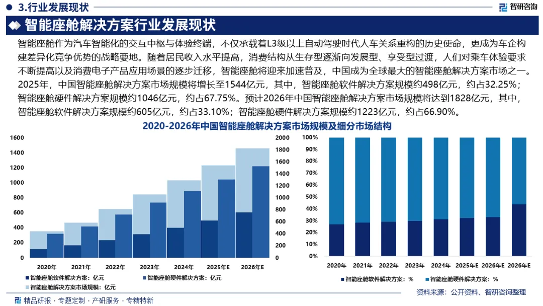 智能座舱解决方案是指针对配备智能车内产品和系统的汽车座舱的综合解决方案。智能座舱作为汽车智能化的交互中枢与体验终端,不仅承载着L3级以上自动驾驶时代人车关系重构的历史使命,更成为车企构建差异化竞争优势的战略要地。随着居民收入水平提高,消费结构从生存型逐渐向发展型、享受型过渡,人们对乘车体验要求不断提高以及消费电子产品应用场景的逐步迁移,智能座舱将迎来加速普及,中国成为全球最大的智能座舱解决方案市场之一。2025年,中国智能座舱解决方案市场规模将增长至1544亿元,其中,智能座舱软件解决方案规模约498亿元,约占32.25%;智能座舱硬件解决方案规模约1046亿元,约占67.75%。预计2026年中国智能座舱解决方案市场规模将达到1828亿元,其中,智能座舱软件解决方案规模约605亿元,约占33.10%;智能座舱硬件解决方案规模约1223亿元,约占66.90%。