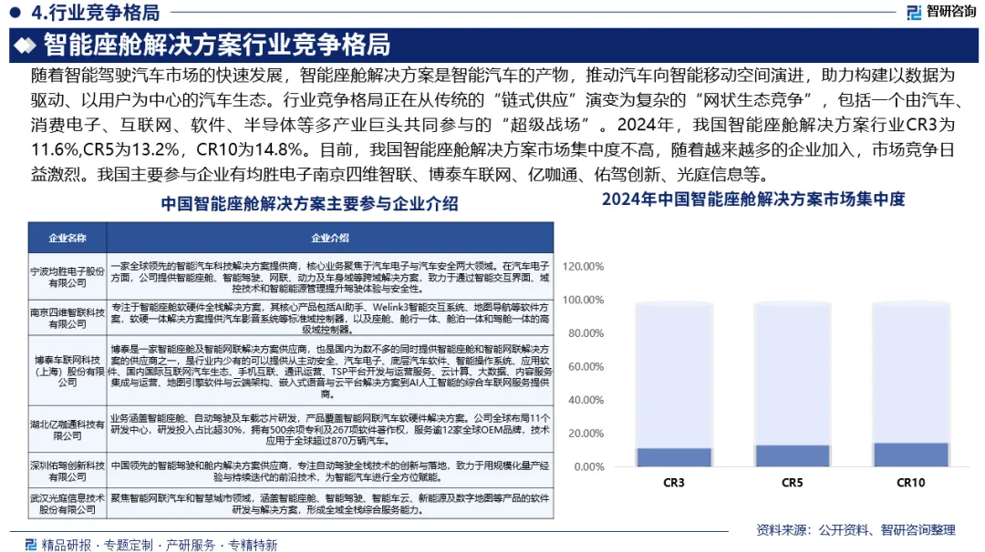竞争情况:智能座舱解决方案行业竞争格局正在从传统的“链式供应”演变为复杂的“网状生态竞争”。目前,我国智能座舱解决方案市场集中度不高。2024年,我国智能座舱解决方案行业CR3为11.6%,CR5为13.2%,CR10为14.8%。随着越来越多的企业加入,市场竞争日益激烈,我国主要参与企业有均胜电子南京四维智联、博泰车联网、亿咖通、佑驾创新、光庭信息等。