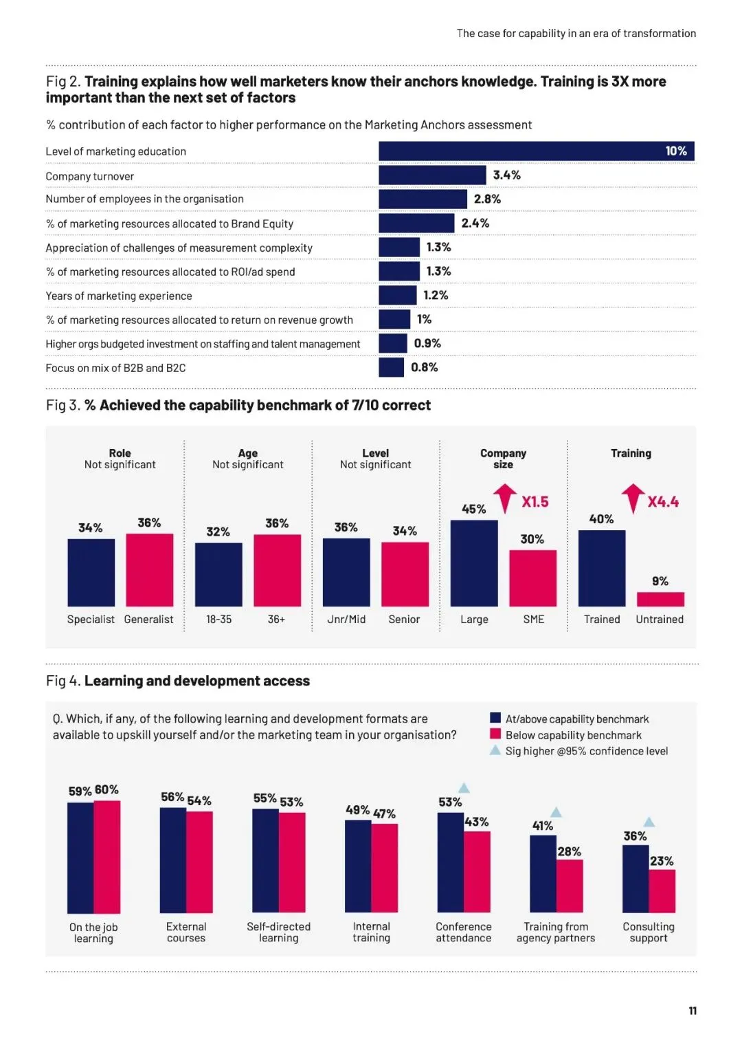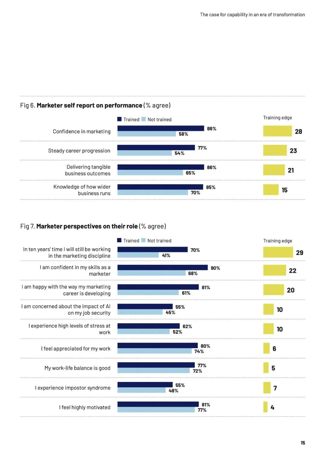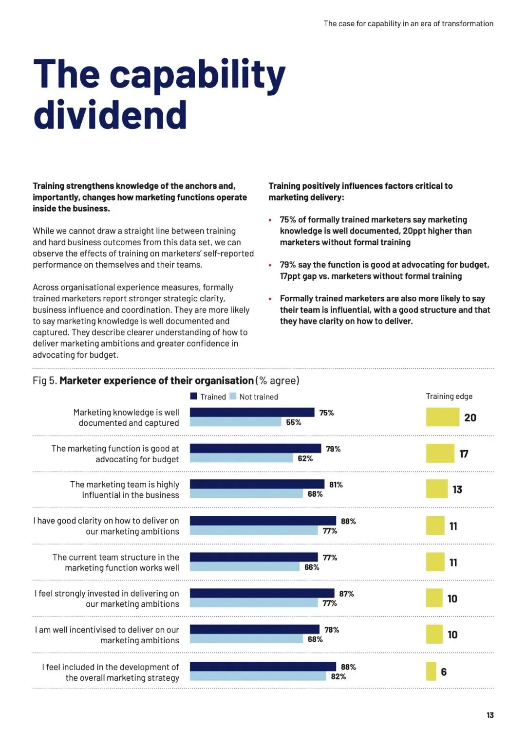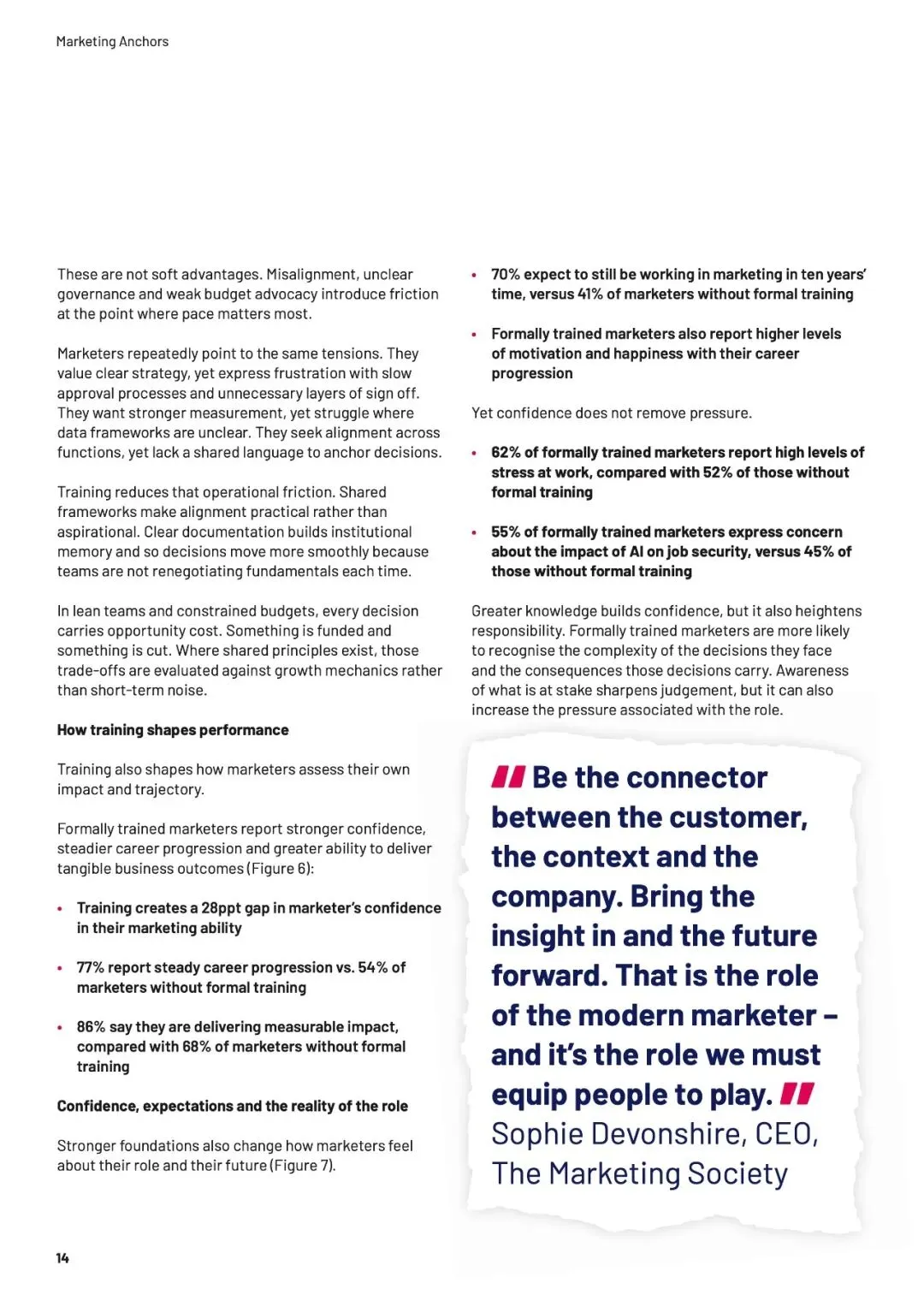 速度本身不是问题,无知的加速才是。当团队缺乏“营销锚点”——品牌增长的基本框架与共同语言时,信息越多,决策越像赌博。数据揭示,培训不仅构建认知,更能转化为“能力红利”:受训者在预算争取、职业信心和可衡量影响力上,均领先未受训者超20个百分点。AI放大了这一鸿沟——生成答案越容易,提出正确问题的能力就越稀缺。