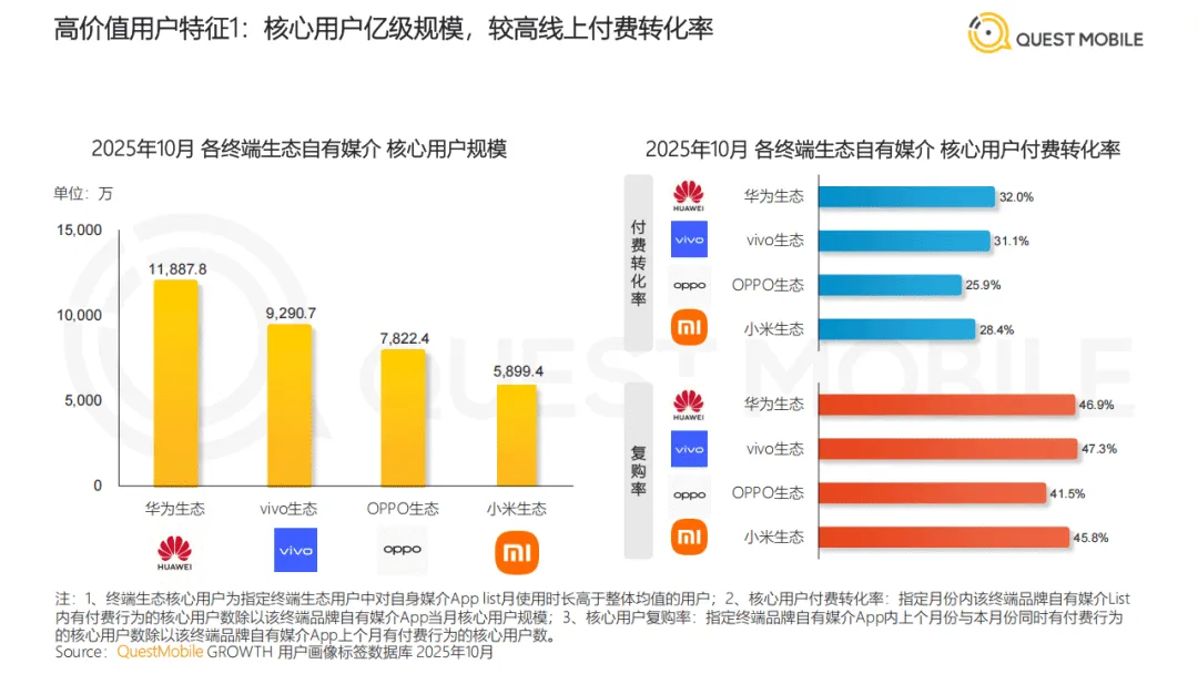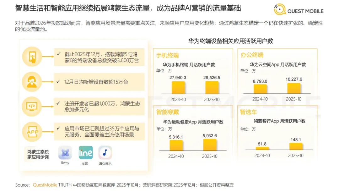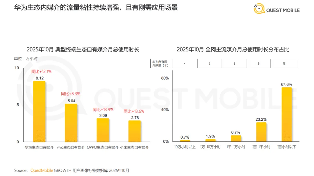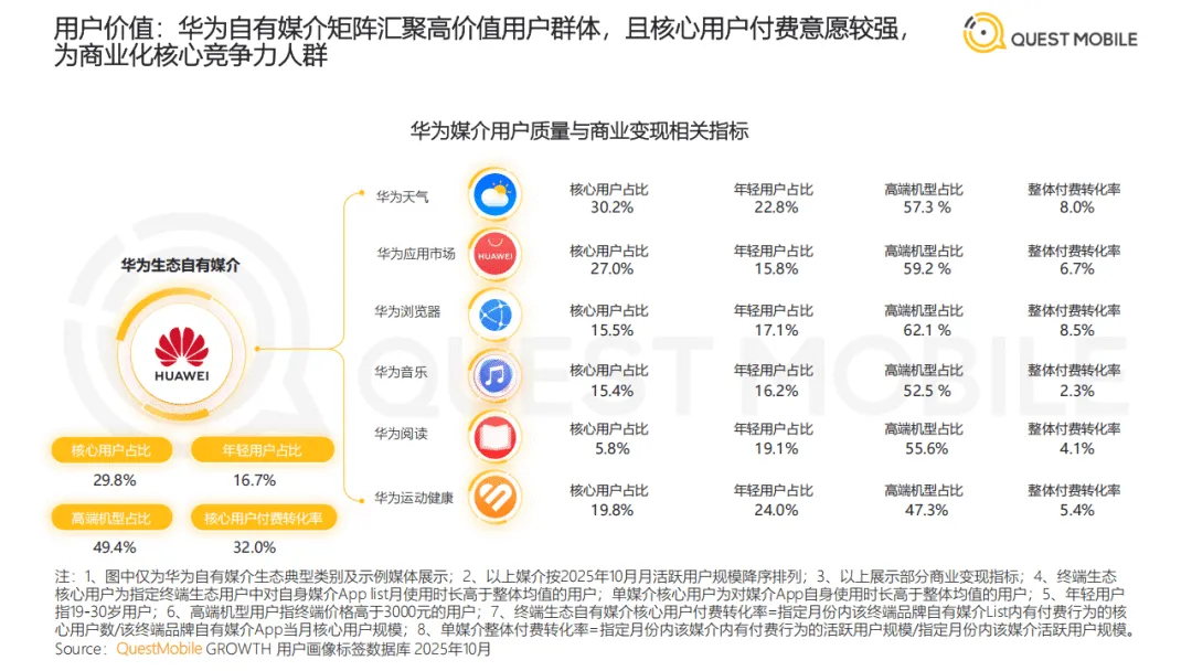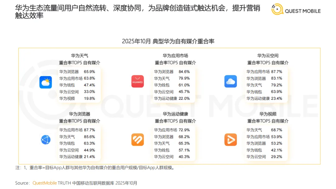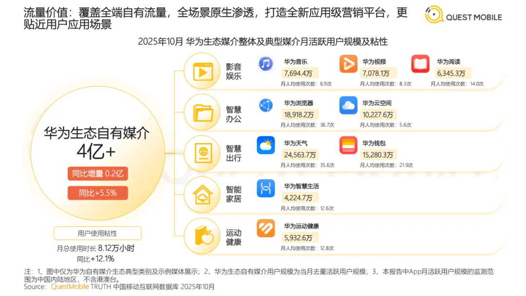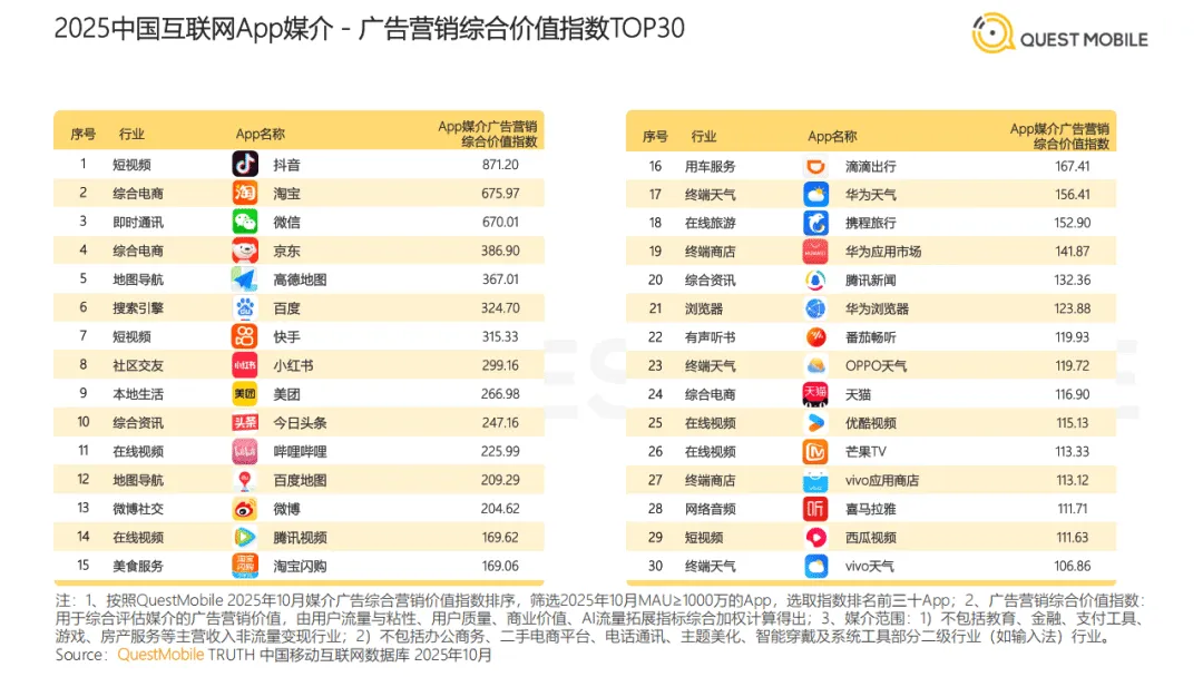 报告显示,2025年10月全网APP媒介广告营销综合价值指数TOP30中,抖音、淘宝、微信位列前三,短视频、综合电商、即时通讯类平台占据流量与商业价值核心地位,华为天气、华为应用市场等终端生态媒介也跻身榜单,体现终端生态媒介的营销价值潜力。