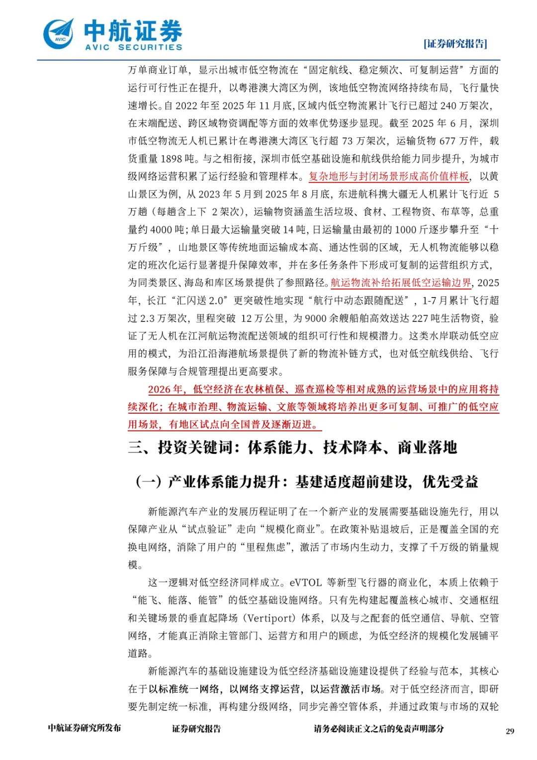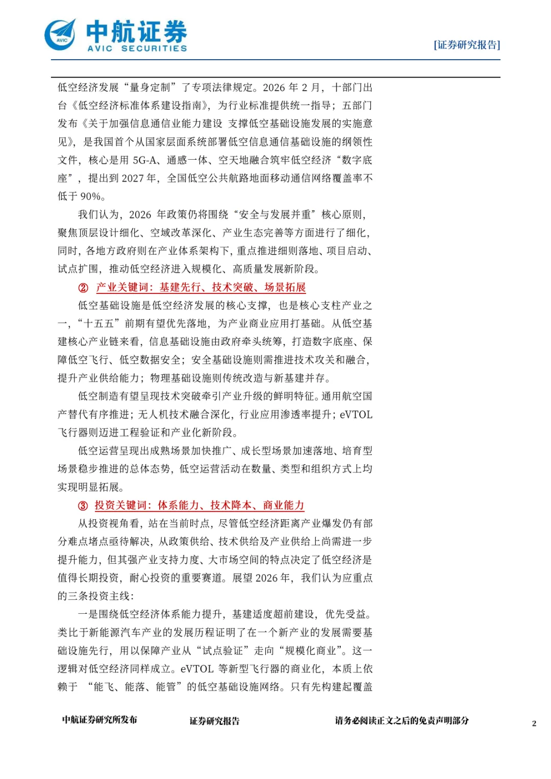 2026 年是低空经济从 “产业培育” 向 “规模增长” 转型的关键一年,政策、技术、基建、场景的多维突破将推动产业进入长牛发展周期。尽管仍面临诸多挑战,但在战略定位明确、政策保障有力、市场需求旺盛的多重驱动下,低空经济将逐步形成 “基建支撑 - 技术引领 - 场景盈利 - 资本赋能” 的正向循环,成为推动经济高质量发展的重要引擎。投资者与产业参与者需保持耐心与定力,把握细分领域的结构性机遇,共同迎接低空经济的规模化发展时代。