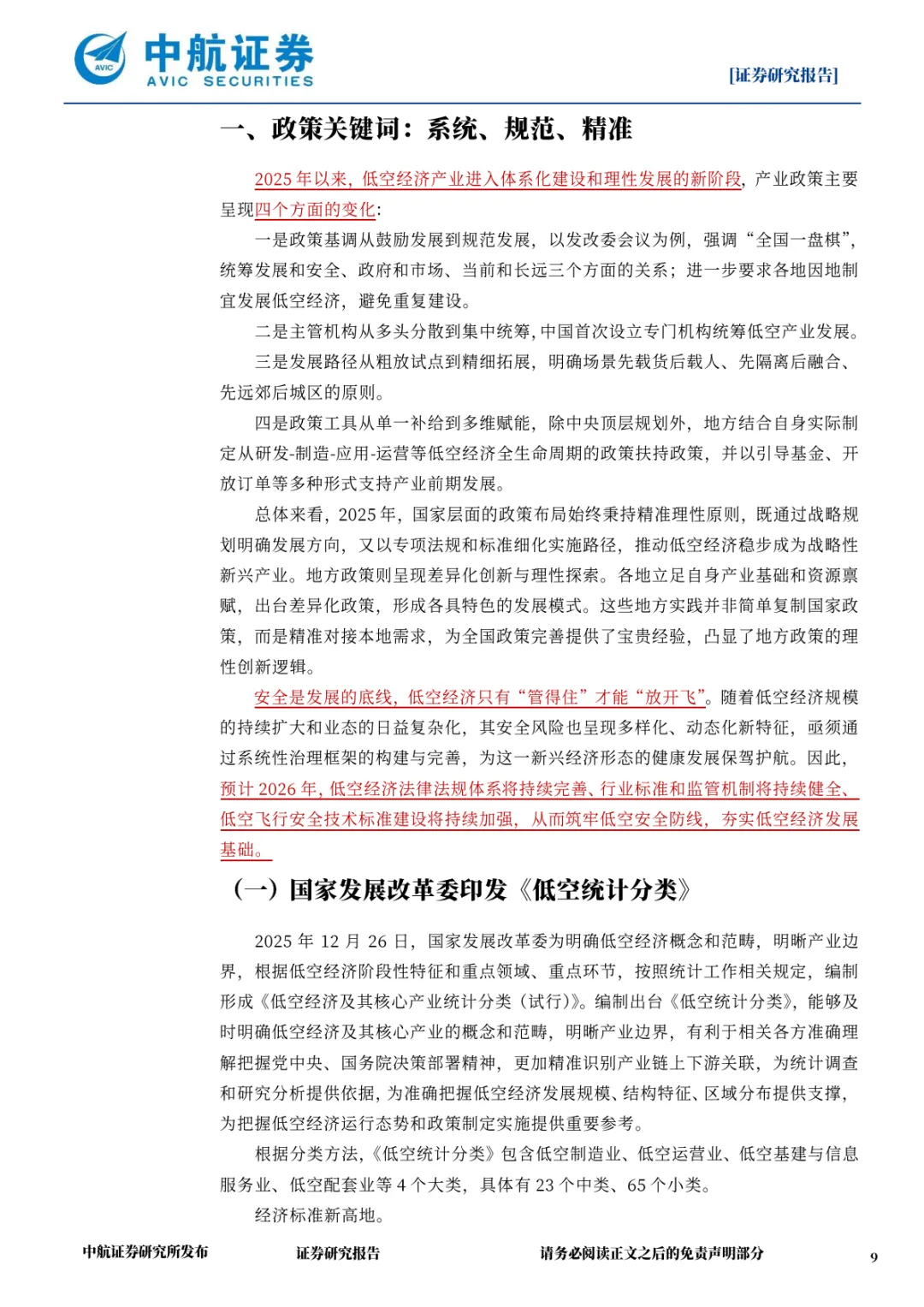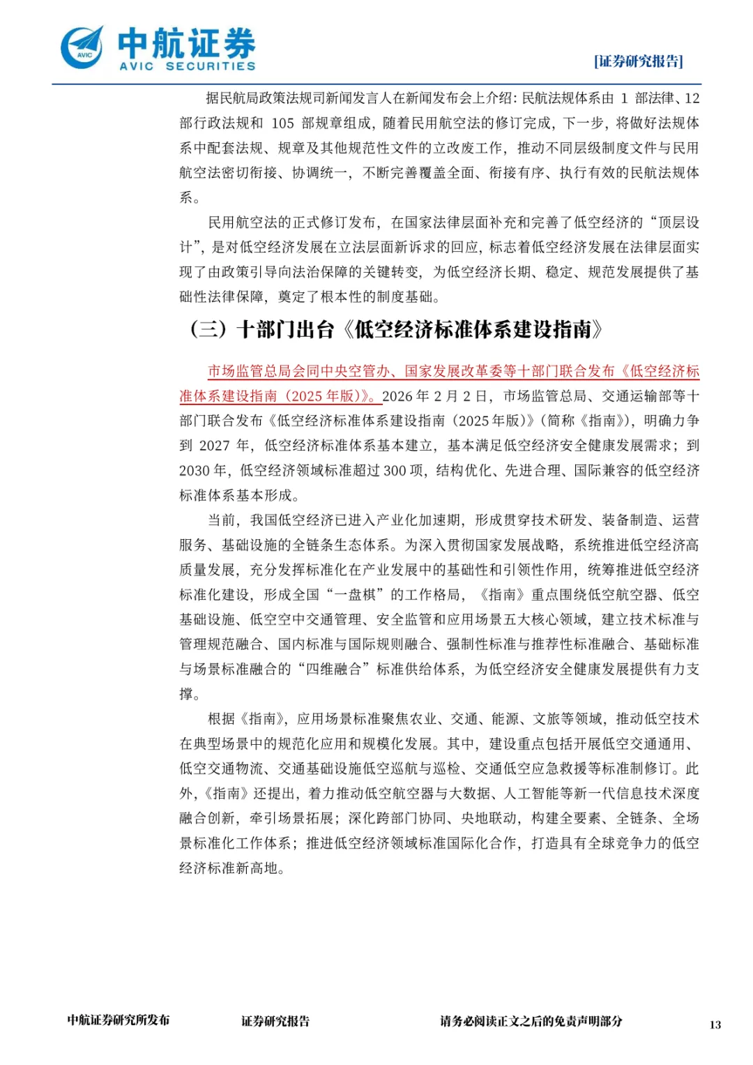 分类与标准层面:2025 年 12 月印发的《低空统计分类(试行)》将产业划分为低空制造业、运营业、基建与信息服务业、配套业 4 大类 23 中类 65 小类,厘清产业边界;2026 年 2 月十部门联合发布的《低空经济标准体系建设指南》,明确 2027 年基本建立标准体系、2030 年形成超 300 项标准的目标,聚焦航空器、基建、空管、安全、场景五大领域,构建 “四维融合” 标准供给体系。