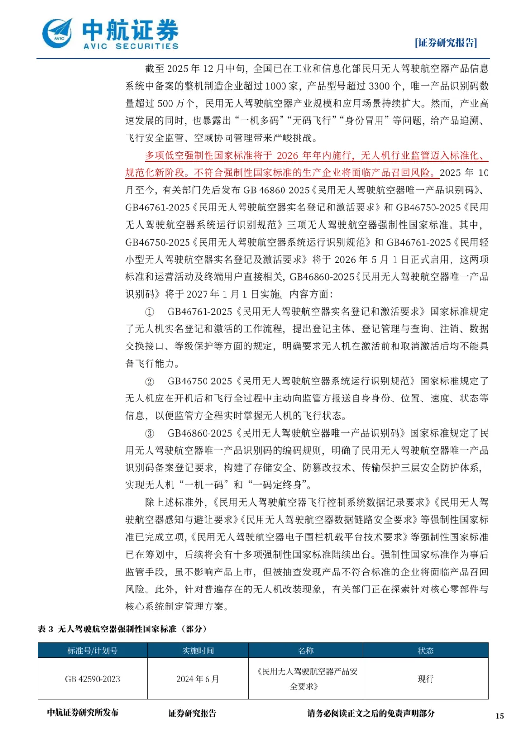 多项强制性国家标准密集落地,2026 年 5 月起《民用无人驾驶航空器实名登记和激活要求》《民用无人驾驶航空器系统运行识别规范》正式施行,要求无人机 “激活前不可飞、飞行全程报状态”;2027 年 1 月实施《民用无人驾驶航空器唯一产品识别码》标准,实现 “一机一码、一码定终身”。后续十多项标准将陆续立项,覆盖飞行控制、感知避让、电子围栏等关键领域,推动行业监管进入标准化阶段。