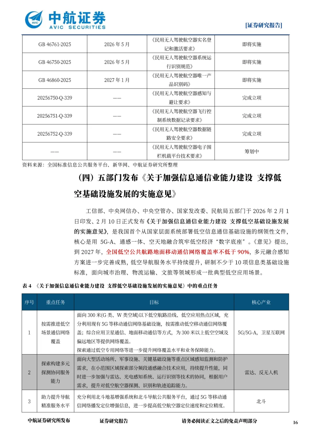 基础设施专项政策:五部门发布的《关于加强信息通信业能力建设支撑低空基础设施发展的实施意见》,提出 2027 年全国低空公共航路地面移动通信网络覆盖率不低于 90% 的核心目标,部署 5G-A 通感融合、北斗导航增强等十大重点任务,成为低空信息通信基建的纲领性文件。