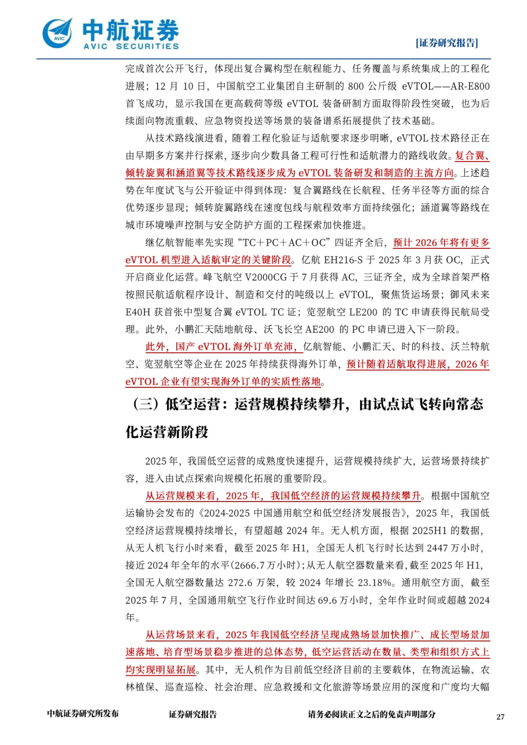 2025 年 H1 全国无人机飞行时长达 2447 万小时,接近 2024 年全年水平;无人航空器数量达 272.6 万架,同比增长 23.18%。2026 年将延续增长态势,货运物流、巡检服务、应急保障等场景收入规模快速提升,载人飞行在部分试点城市实现商业化突破。