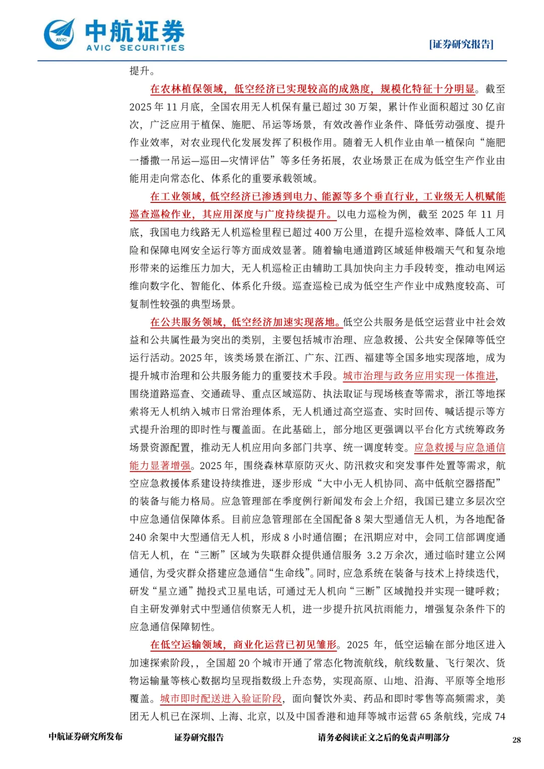 公共服务:城市治理中无人机广泛应用于道路巡查、执法取证等场景,应急救援领域形成 “大中小无人机协同” 格局,8 小时通信圈覆盖全国,在 “三断” 区域搭建应急通信生命线;