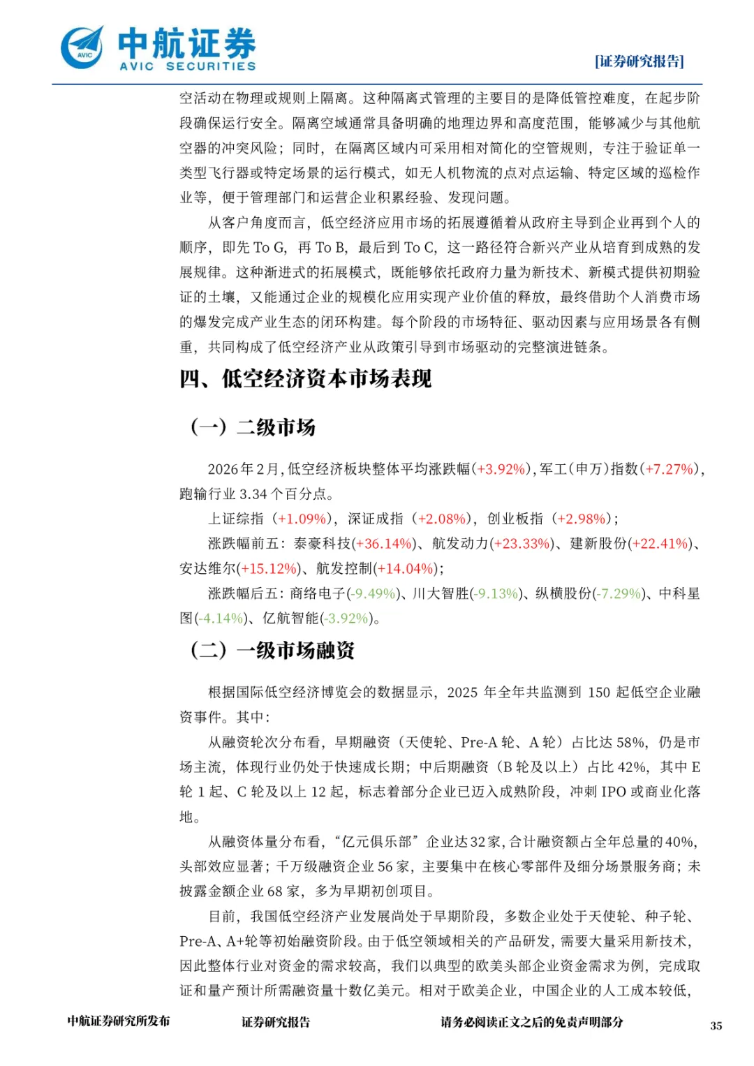 2026 年 2 月,低空经济板块平均涨跌幅为 + 3.92%,跑输军工(申万)指数 3.34 个百分点,个股表现分化显著。泰豪科技(+36.14%)、航发动力(+23.33%)等企业凭借技术突破与订单落地领涨,而部分缺乏实质进展的企业表现承压。未来,基建、核心零部件、场景运营龙头企业将持续获得资金青睐。