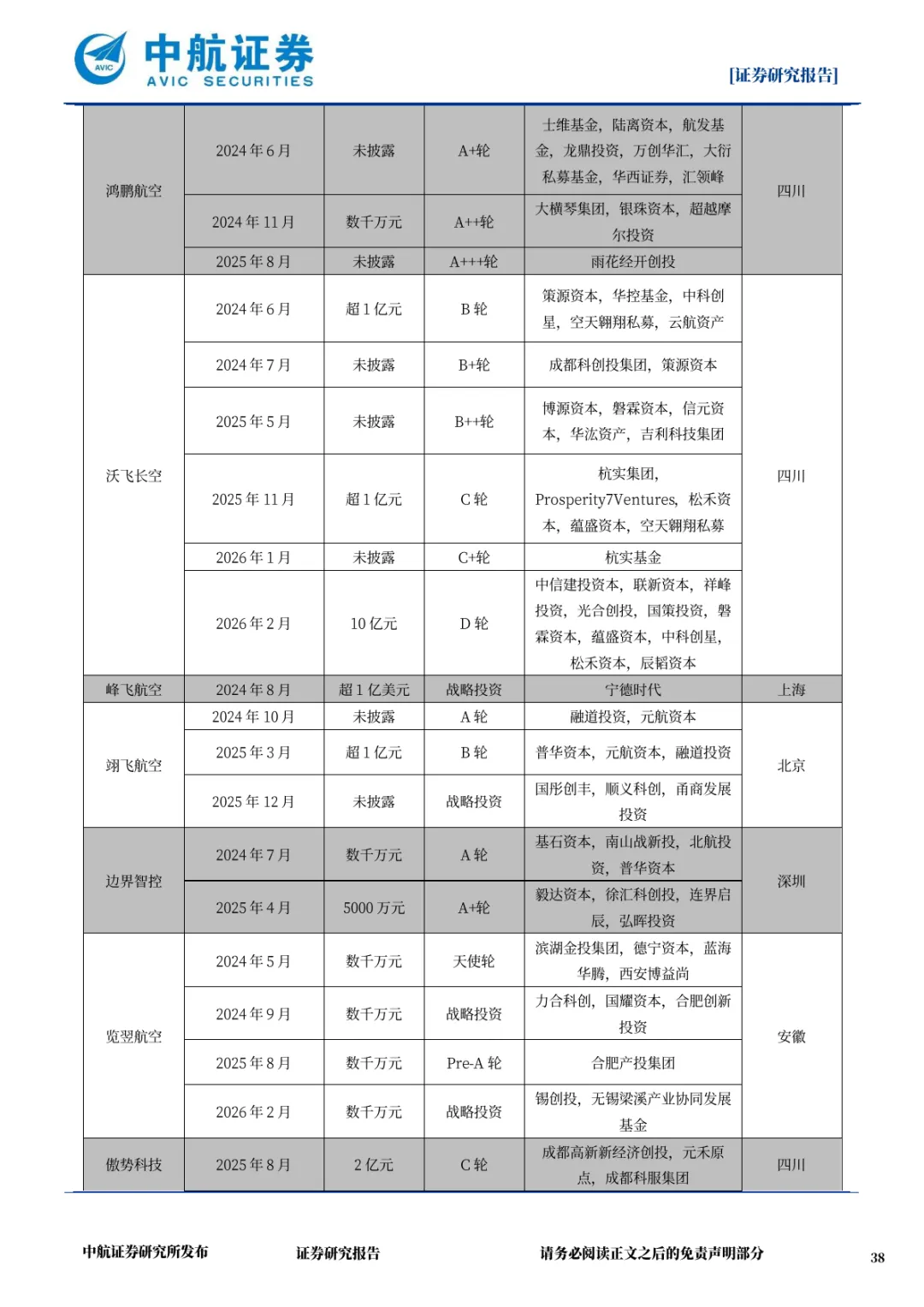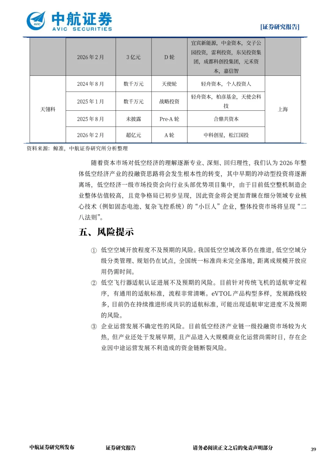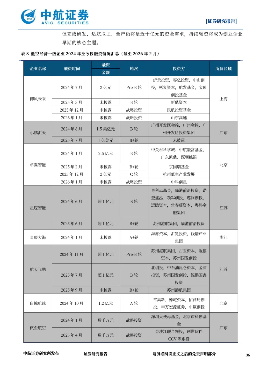 2025 年全年监测到 150 起低空企业融资事件,早期融资(天使轮、Pre-A 轮、A 轮)占比 58%,体现行业仍处快速成长期;中后期融资占比 42%,标志部分企业迈向成熟阶段。2026 年融资思路将发生根本性转变,资金从分散投向整机制造转向聚焦固态电池、复杂飞控系统等细分领域的 “小巨人” 企业,呈现 “二八法则” 特征。头部企业融资规模显著提升,沃飞长空 2026 年 2 月完成 10 亿元 D 轮融资,傲势科技获超 3 亿元 C 轮融资,为适航取证与量产提供资金支持。