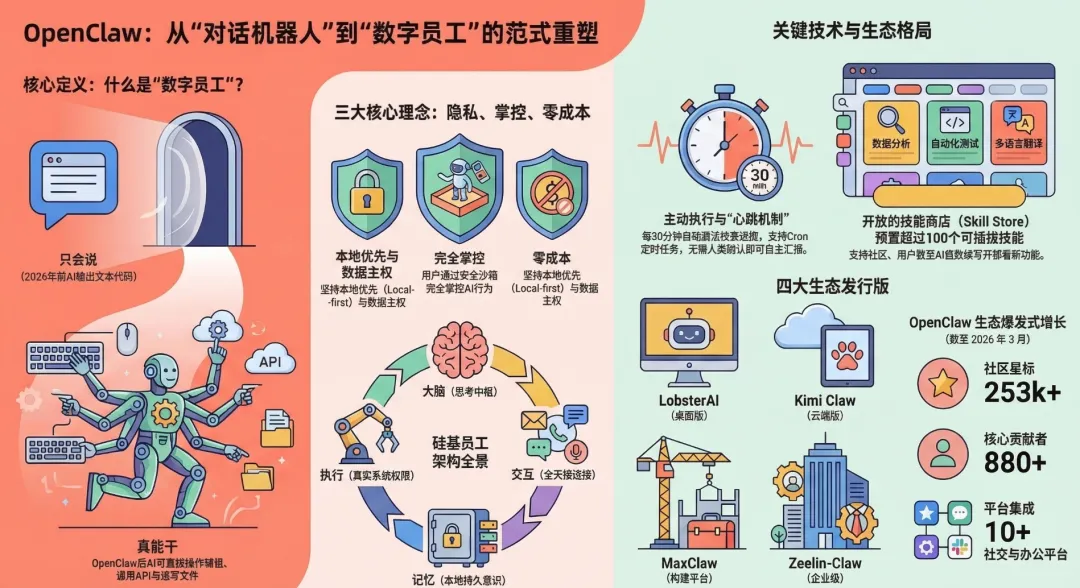 OpenClaw是2026年最具活力的开源AI代理生态,以本地优先、隐私至上为核心,实现了从简单对话工具到能自主执行操作的“数字员工”的跨越,同时形成了完整的技术架构、本土化生态和多元变现模式,其代表的AI代理模式被认为是未来生产力发展的重要方向。