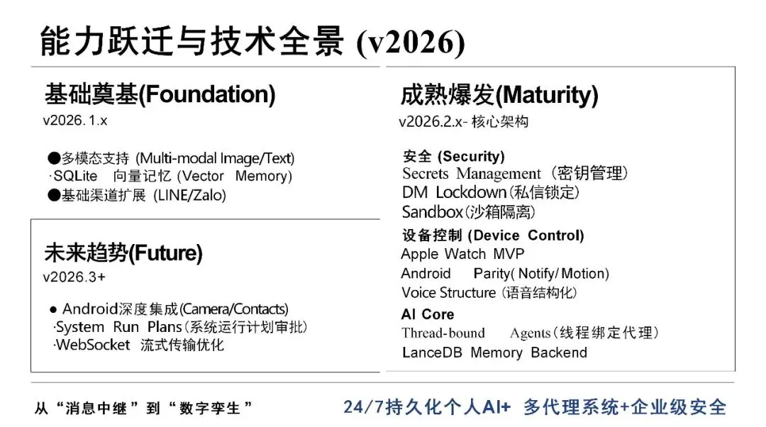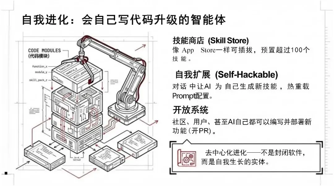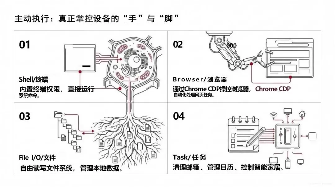 其六大核心特点重塑AI生产力范式:持久化实现本地记忆存储,跨设备无缝重启;自我进化可自主编写代码升级,技能商店预置超100个可插拔技能;主动执行能操控终端、文件、浏览器等,完成清理邮箱、控制智能家居等实操任务;统一控制接管各类通讯软件,用户在任意聊天窗口即可发指令,实现“万流归宗”。