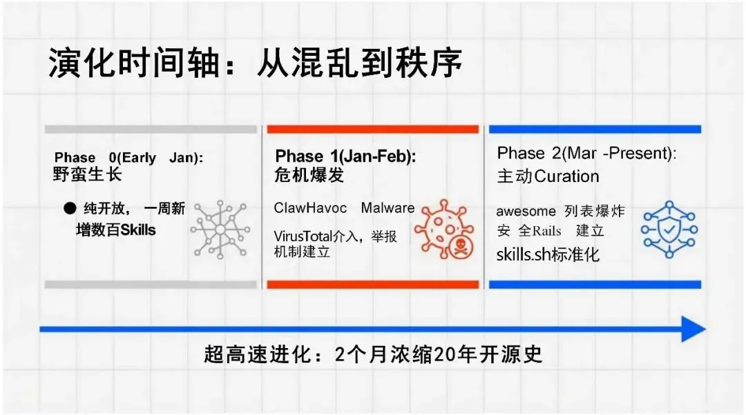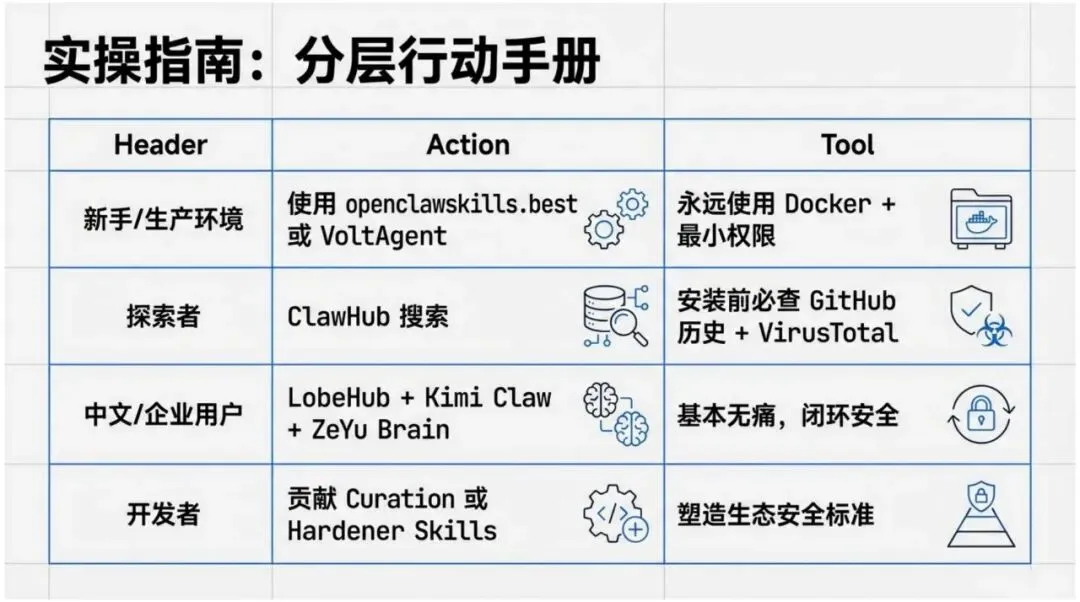 OpenClaw已形成多层混合的技能生态,核心以ClawHub为创新源头,同时有openclawskills.best等安全过滤器,不过生态存在恶意软件、机密泄露等风险,目前已形成分层使用准则:生产环境用安全过滤平台,探索者可使用ClawHub并做安全核查,中文企业用户适配LobeHub+Kimi Claw的云端闭环。