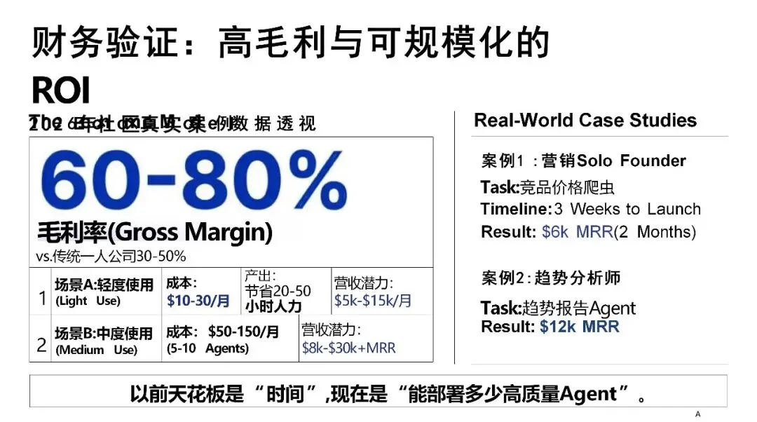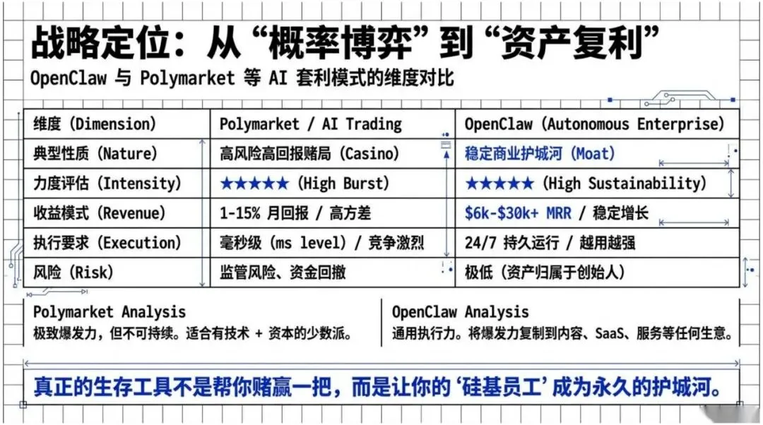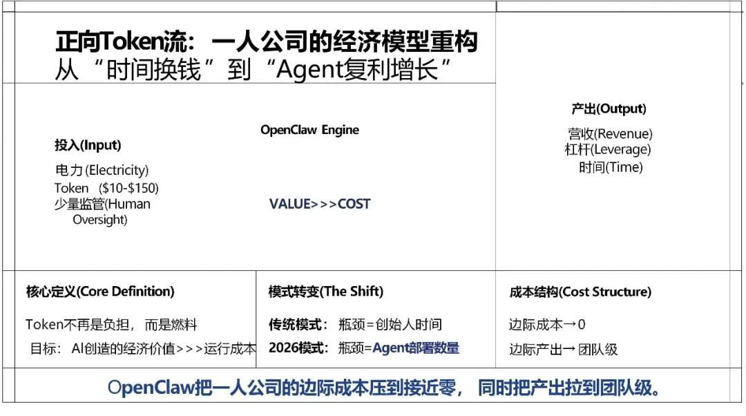 变现体系上,OpenClaw打破传统云端租户模式,构建本地主权的数字生命经济,分五级实现价值变现,从基础的技能交易,到记忆共振交付、知识孢子传播,再到一人公司商业OS和蜂巢思维协作,核心是让AI成为可编程的个人操作系统。其中一人公司是核心形态,依托OpenClaw可将边际成本压至近零,毛利率达60%-80%,远高于传统一人公司的30%-50%,轻度使用每月即可实现5k-15k美元营收。