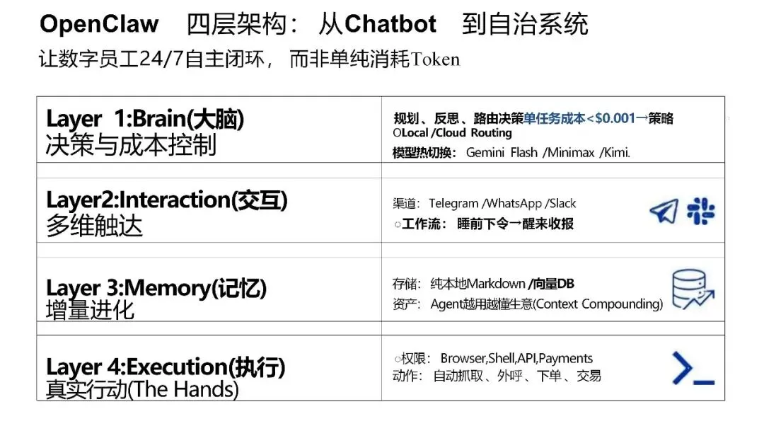 OpenClaw的核心是打造24/7持久化个人AI+多代理系统+企业级安全的自治实体,并非单一AI模型,而是整合了思考中枢、记忆体、执行能力的“数字大脑”,可实现模型热切换,不绑定单一厂商。