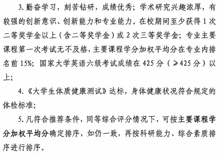 凡符合推荐条件,同等综合评分情况下,可按主要课程学分加权平均分确定排序,如仍一致,再按科研能力、综合素质排序进行排序。
