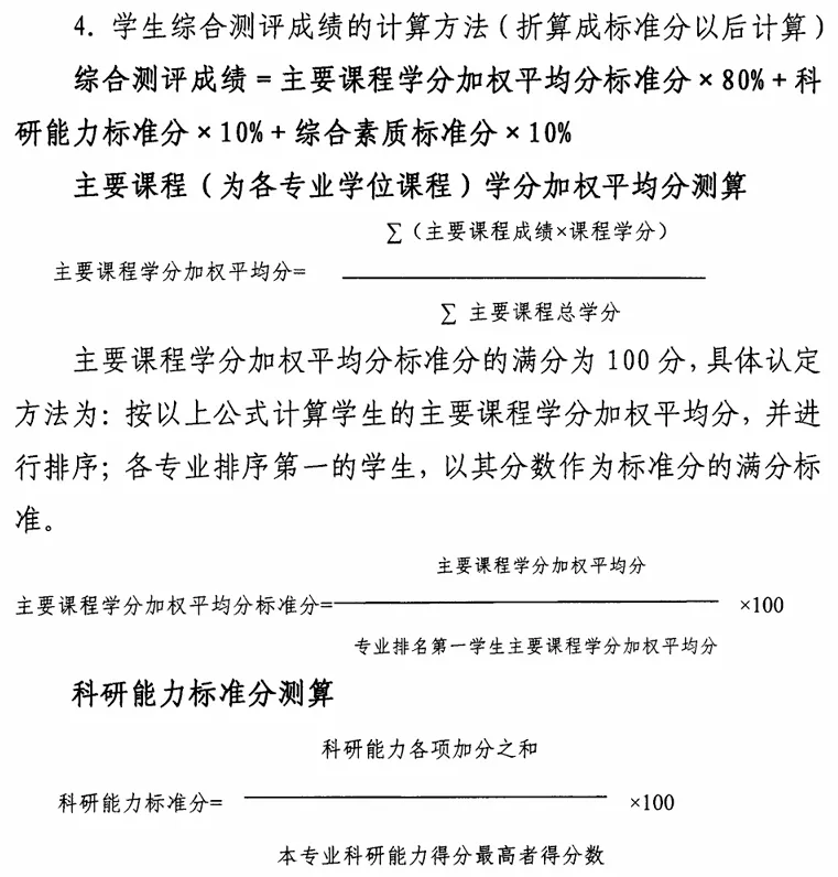学生综合测评成绩的计算方法(折算成标准分以后计算)。综合测评成绩=主要课程学分加权平均分标准分x80%+科研能力标准分x10%+综合素质标准分x10%。