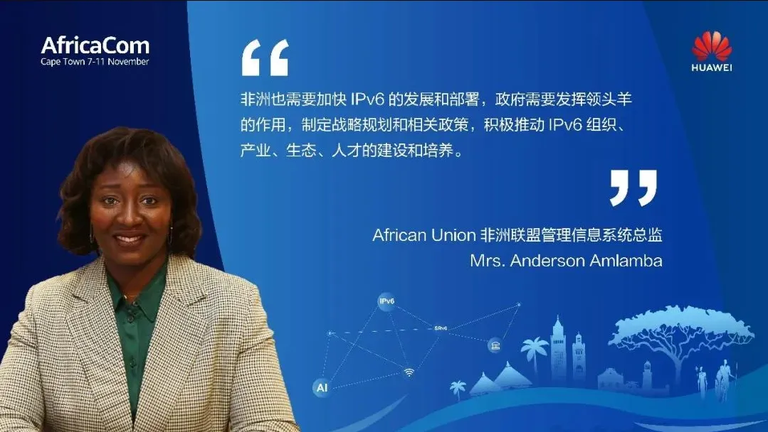 African Union非洲联盟管理信息系统总监Mrs. Anderson Amlamba指出,IPv6的重要性在全球已经成为一个共识,并从终端、网络、应用、云平台等方面来看,IPv6的产业生态也已然成熟。非洲也需要加快IPv6的发展和部署,政府需要发挥领头羊的作用,制定战略规划和相关政策,积极推动IPv6组织、产业、生态、人才的建设和培养。