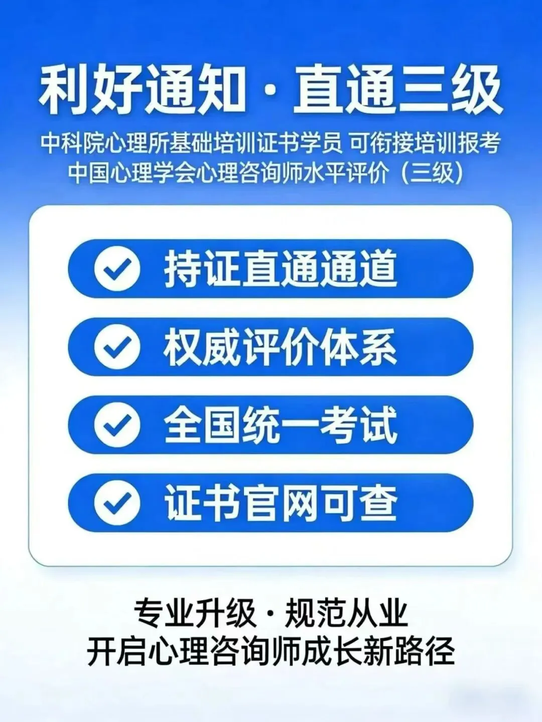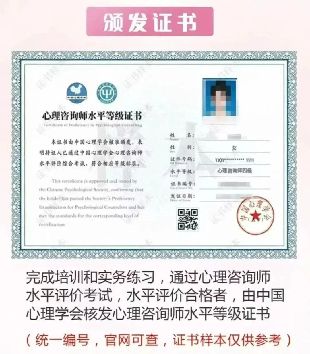 二、证书现状:告别“考证即执业”,理性看待水平评价2017年人社部取消心理咨询师国家职业资格后,行业转向学会/协会水平评价模式,目前国内并无“国家统一执业证书”,各类水平评价证书仅代表学习经历与能力水平,不具备法定执业资质。中国心理学会作为国内心理学界权威学术机构,其开展的职业水平评价项目,以“提升从业者胜任力”为核心,分级培养体系覆盖入门到资深,重点强调理论学习、实务训练与持续督导,帮助从业者建立系统的专业能力,而非单纯“发证”。
