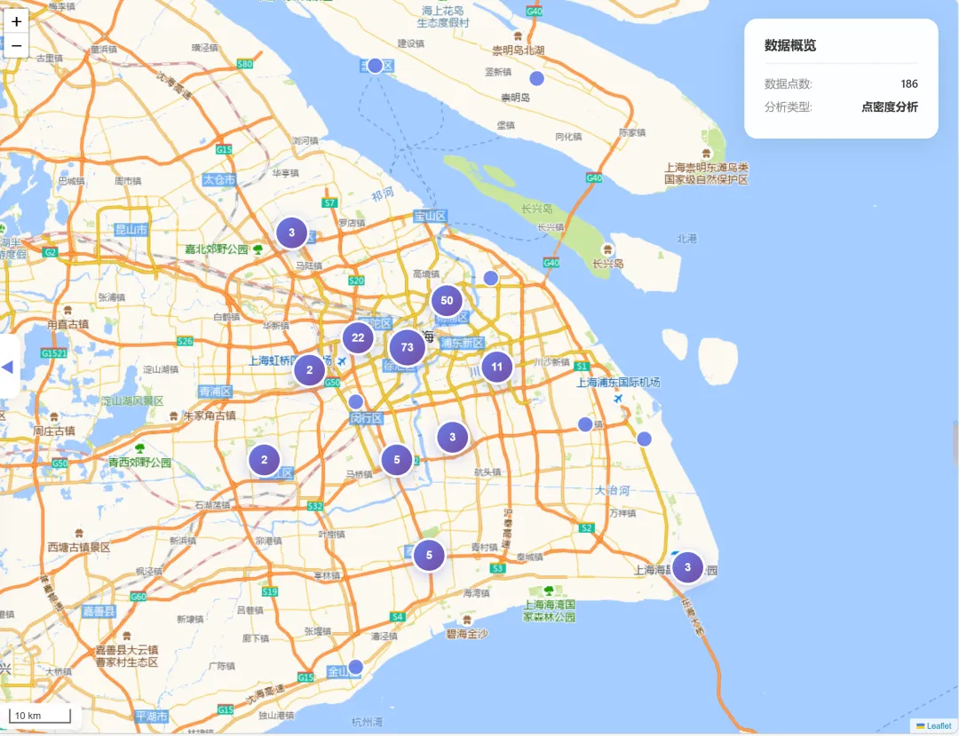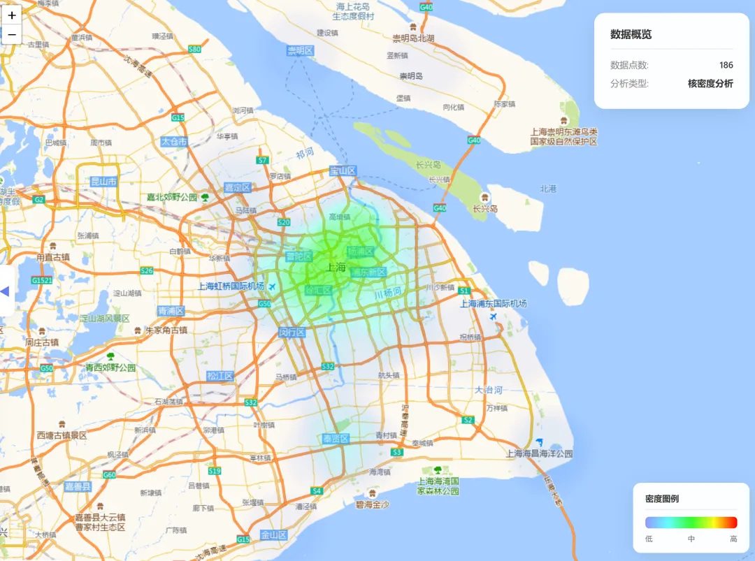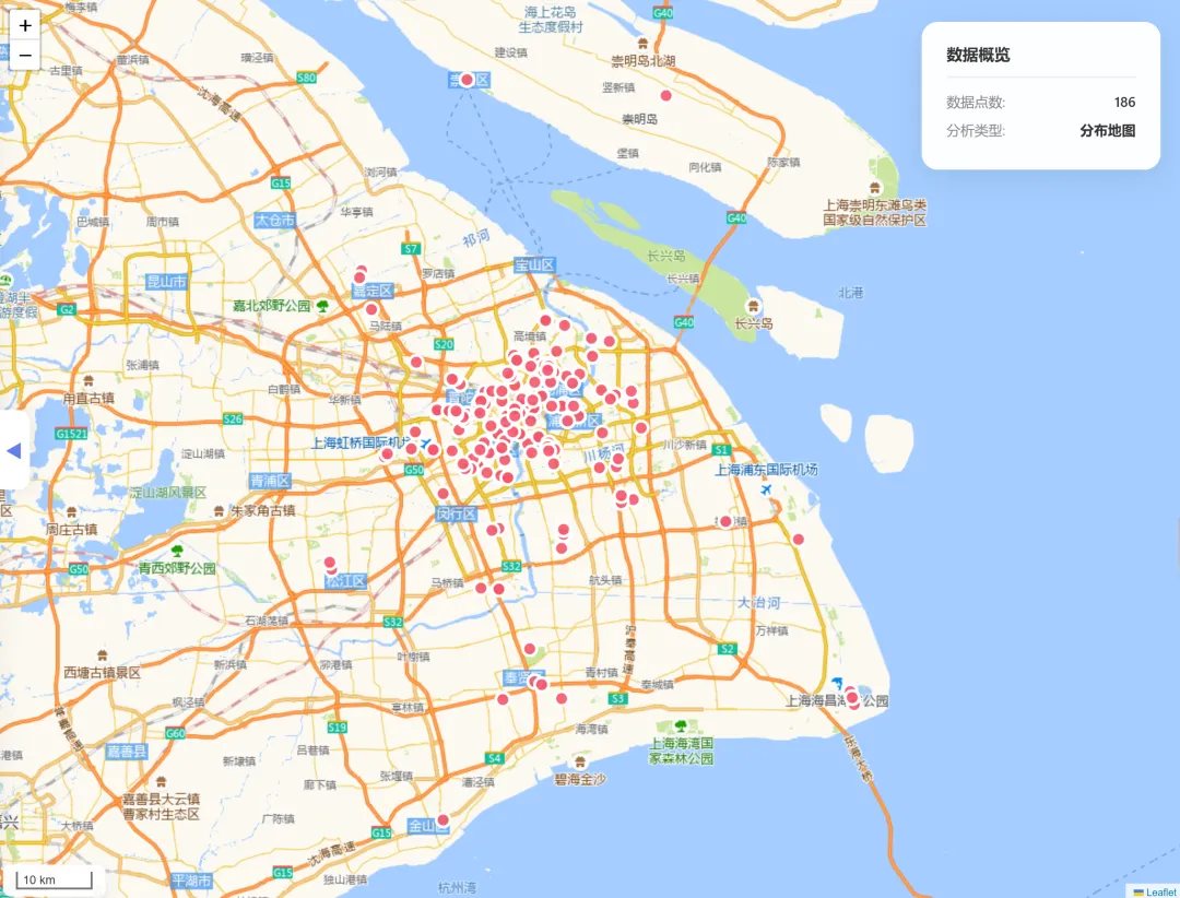 本研究数据来源于高德地图(amap)POI(兴趣点)数据库,以“设计院”为关键词进行搜索,共获取上海市范围内有效观测点186个。分析采用空间分析法、分类统计法、商圈聚类法相结合的研究框架。空间分析法用于揭示宏观分布规律;分类统计法用于解构行业内部生态;商圈聚类法则从微观商业地理视角,识别产业集聚的“热力点”。