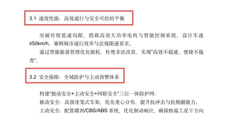 速度与安全的平衡:突破低速局限,搭载高效大功率电机与智能控制系统,实现高效通行。同时构建“被动安全+主动安全+网联安全”三位一体防护网:高强度笼式车架、碟刹/CBS/ABS系统、胎压监测、盲区监测、碰撞预警及AI辅助驾驶,实现风险前置干预。