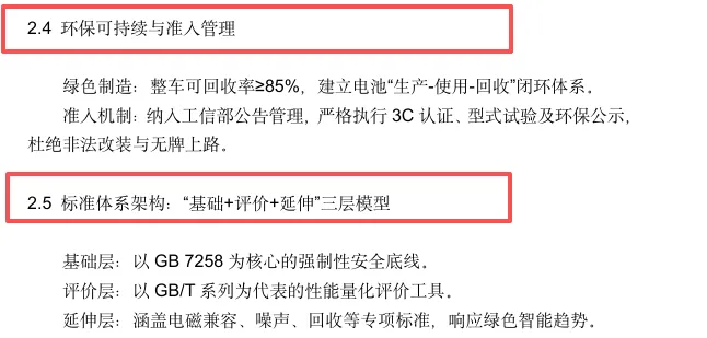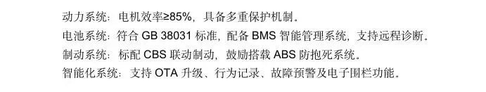 这一体系以GB7258《机动车运行安全技术条件》为核心底线,融合电气安全、电池安全、电磁兼容等多项国家强制标准与推荐标准,形成“基础 + 评价 + 延伸”的三层架构,让休三电摩从诞生之初就具备合规合法的 “身份标签”。