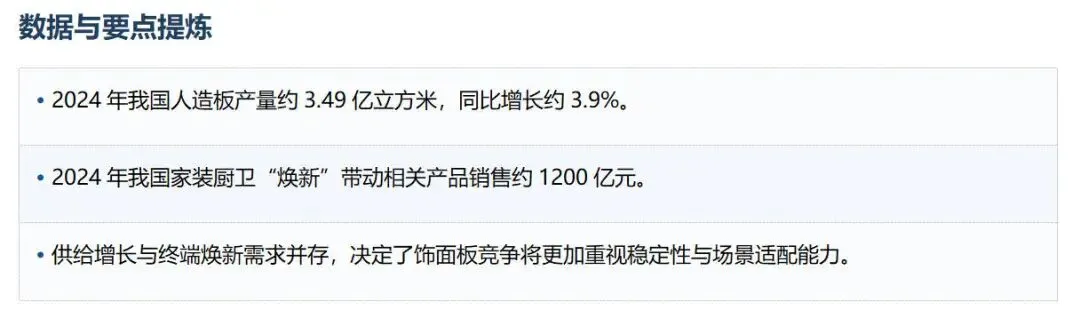 标准升级,不只是检测条款更细,而是市场门槛正在重构饰面类板材并不是单纯的原材料,它直接决定了柜体、墙板、家具部件等终端产品的外观、耐磨、耐污染、耐香烟灼烧、耐龟裂和耐剥离等使用体验。围绕浸渍胶膜纸饰面板相关标准的持续关注,本质上反映的是行业对“可验证品质”的要求正在提高。过去,部分企业竞争依赖产能、价格和交期;如今,环保一致性、表面性能稳定性、批次复制能力和标准化表达能力,正在成为更关键的竞争因子。从行业运行数据看,供给侧扩张仍在继续。2024年我国人造板产量约3.49亿立方米,同比增长约3.9%;消费量约3.30亿立方米,同比增长约3.5%。这意味着市场并没有停滞,但竞争压力同步增强。尤其在刨花板、饰面板等细分领域,新增产能更快、替代关系更复杂,市场倒逼企业必须通过更清晰的产品分层、更稳定的品质控制来建立优势。标准升级的价值,恰恰在于它将“合格”与“可信”之间的差距具体化、透明化。很多企业对标准的理解仍停留在“抽检合格”层面,但饰面板竞争的真正难点从来不是某一批产品过检,而是不同批次、不同花色、不同季节、不同订单条件下,能否长期保持稳定。对终端客户而言,他们采购的并不是某一张板,而是一套可以复购、可以复制、可以追溯的产品系统。在定制家居、工程配套和品牌零售渠道中,饰面板承担的是“被看见”的角色。消费者未必理解所有技术参数,但一定会注意到表面是否耐脏、封边是否协调、板件是否容易起泡、柜门与柜体是否存在明显色差。终端投诉往往不是发生在工厂出货时,而是发生在安装后、使用中、对比里。因此,企业必须把标准要求向前延伸到原纸、胶黏剂、基材、热压工艺、养生时间、仓储条件和成品检验全过程,而不是只在最后一道工序进行结果管理。从消费端看,政策仍在推动存量家装焕新。2024年家装厨卫“焕新”带动相关产品销售约1200亿元,销售相关产品近6000万件。需求并没有消失,只是正在从单一建材采购转向更重视环保、颜值、交付体验和空间整体感的系统消费。这意味着,进入需求端的板材,已经不只是“基材+表面”的工业品,而是空间解决方案的一部分。当整家定制、旧改焕新、局部翻新成为更高频的应用场景,板材企业服务的对象就不只是下游工厂,还包括品牌商、设计师、装企、渠道商,甚至最终用户。标准因此不再只是技术部门的事情,而是营销、研发、采购、品控和售后共同参与的经营语言。谁能把标准讲清楚、测明白、交得稳,谁就更容易获得高价值客户。行业真正要做的,不是“追标准”,而是“把标准产品化”如果企业把标准仅仅视为合规成本,就会错过升级窗口。事实上,标准升级常常能倒推出三类机会:- 高环保等级产品的体系化。随着ENF、无醛添加、低气味、可追溯等概念被广泛关注,谁能把环保从单点卖点转化为系列化表达,谁就更容易形成品牌溢价。