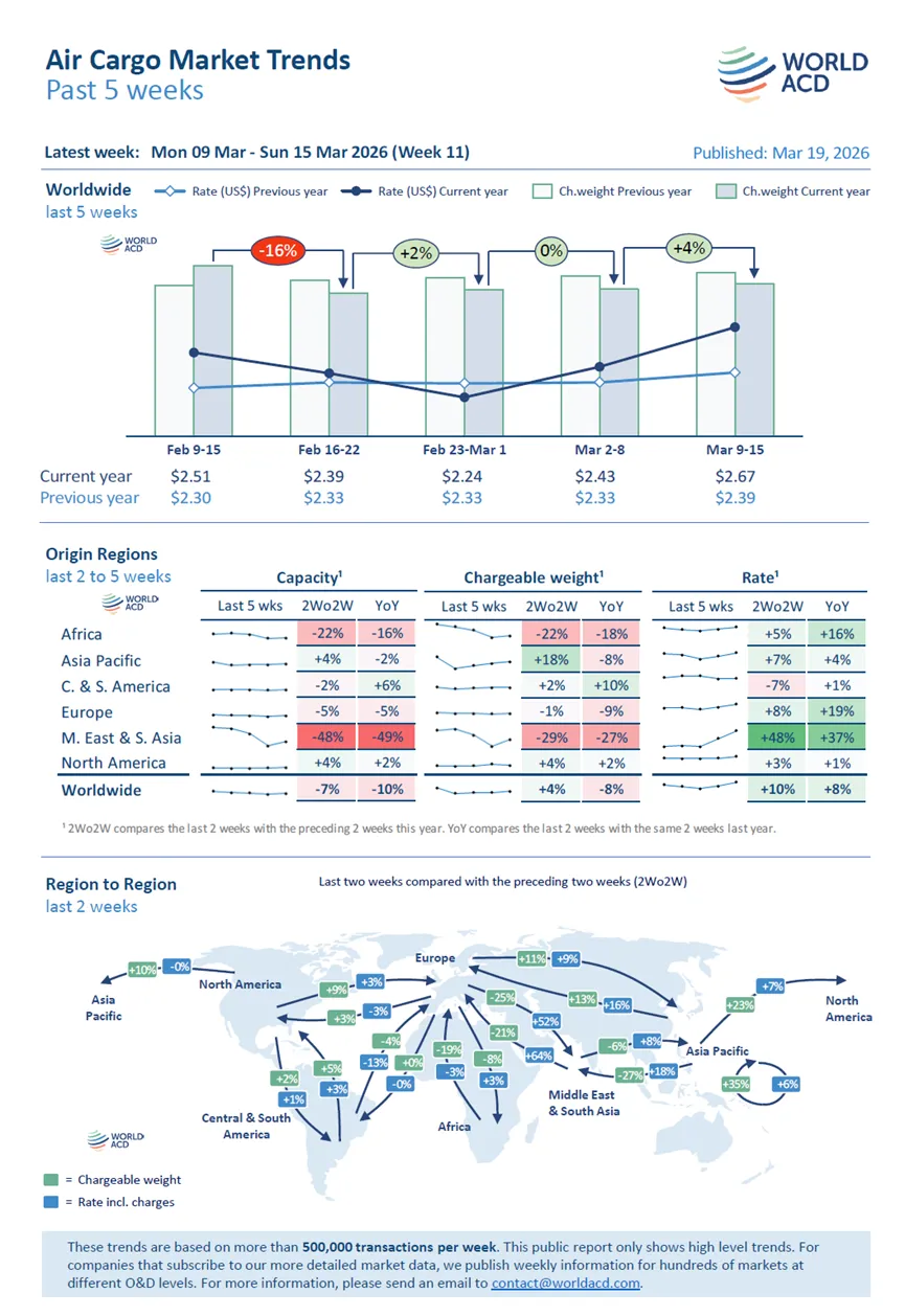 根据WorldACD市场数据覆盖的每周超过50万笔交易数据显示,在承运人、货代与货主共同应对市场中断、运力受限、航线改道、需求积压、局势不确定性以及航空燃油价格上涨的多重压力下,第11周(3月9日至15日)全球全市场空运平均运价(含附加费)在上一周大涨8%的基础上,再度显著上涨10%,达到每公斤2.67美元。