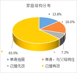 家庭结构:已婚有孩家庭在总人数中占63%(315人),单身与父母同住占比16.0%(80人),单身独居占比13.8%(69人),已婚无孩占比7.2%(36人),家庭结构中已婚有孩家庭为宠物饲养主要群体。
