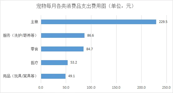 每月用于宠物消费合计为251491元,人均消费503.0元,其中主粮支出最高,合计达114726元,人均月主粮支出229.5元;其次是服务(洗护/寄养等)支出43285元,人均86.6元;零食支出42350元,人均84.7元;医疗支出26580元,人均53.2元;用品(玩具/窝具等)支出24550元,人均49.1元。主粮作为刚性需求,占据消费支出的核心地位。(详见下图)