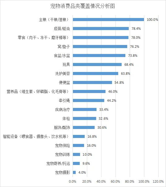 在宠物消费品类覆盖方面,主粮(干粮/湿粮)消费覆盖率达100%(500人),疫苗/驱虫覆盖率78.4%(392人),零食消费覆盖率78%(390人),窝/垫子覆盖率76.2%(381人),食盆/水盆覆盖率73.8%(369人),玩具覆盖率68.4%(342人);而宠物摄影覆盖率仅4%(20人),宠物训练覆盖率10%(50人),宠物寄养/托运覆盖率9.6%(48人),小众服务类消费覆盖率较低。(详见下图)
