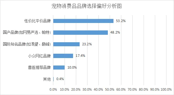 在宠物消费产品的选择偏好上,性价比平价品牌最受青睐,占总人数的53.2%(266人);国产品牌紧随其后,占比48.2%(241人);国际知名品牌占比23.2%(116人);小众网红品牌占比17.4%(87人);兽医推荐品牌占比10%(50人)。性价比与国产品牌成为市场主流选择,反映出消费者理性消费与国产品牌认可度提升的趋势。(详见下图)