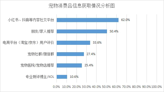 在关于宠物消费信息获取渠道方面,小红书、抖音等内容社交平台关注人数占总人数的62.0%(310人),朋友/家人推荐占比50.4%(252人),电商平台用户评价占比33.6%(168人),宠物社群/微信群占比27.4%(137人),内容社交平台成为首要信息来源。(详见下图)