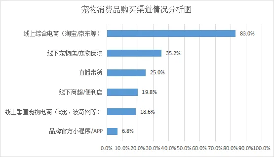 在关于宠物消费购买渠道方面,线上综合电商(淘宝/京东等)占比83%(415人),线下宠物店/宠物医院占比35.2%(176人),直播带货占比25%(125人),线上垂直宠物电商占比18.6%(93人),线下商超/便利店占比19.8%(99人),线上渠道凭借便捷性成为主流购买场景。(详见下图)