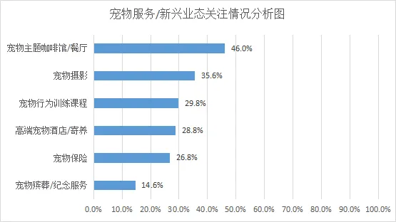 在宠物服务/新兴业态关注度方面,宠物主题咖啡馆/餐厅关注度最高,占总人数的46.0%(230人);宠物摄影占比35.6%(178人);宠物行为训练课程占比29.8%(149人);高端宠物酒店/寄养占比28.8%(144人);宠物保险占比26.8%(134人);宠物殡葬/纪念服务占比14.6%(73人),体验式与服务型新兴业态具有较大市场潜力。(详见下图)