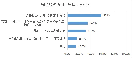 价格虚高、无统一标准是首要问题,占总人数的57.8%(289人);其次是买到“星期宠”,占比34.2%(171人);品种、血统、年龄造假占比31.2%(156人);商家隐瞒宠物患先天性疾病占比15.8%(79人);其他占比15.0(75人)。(详见下图)